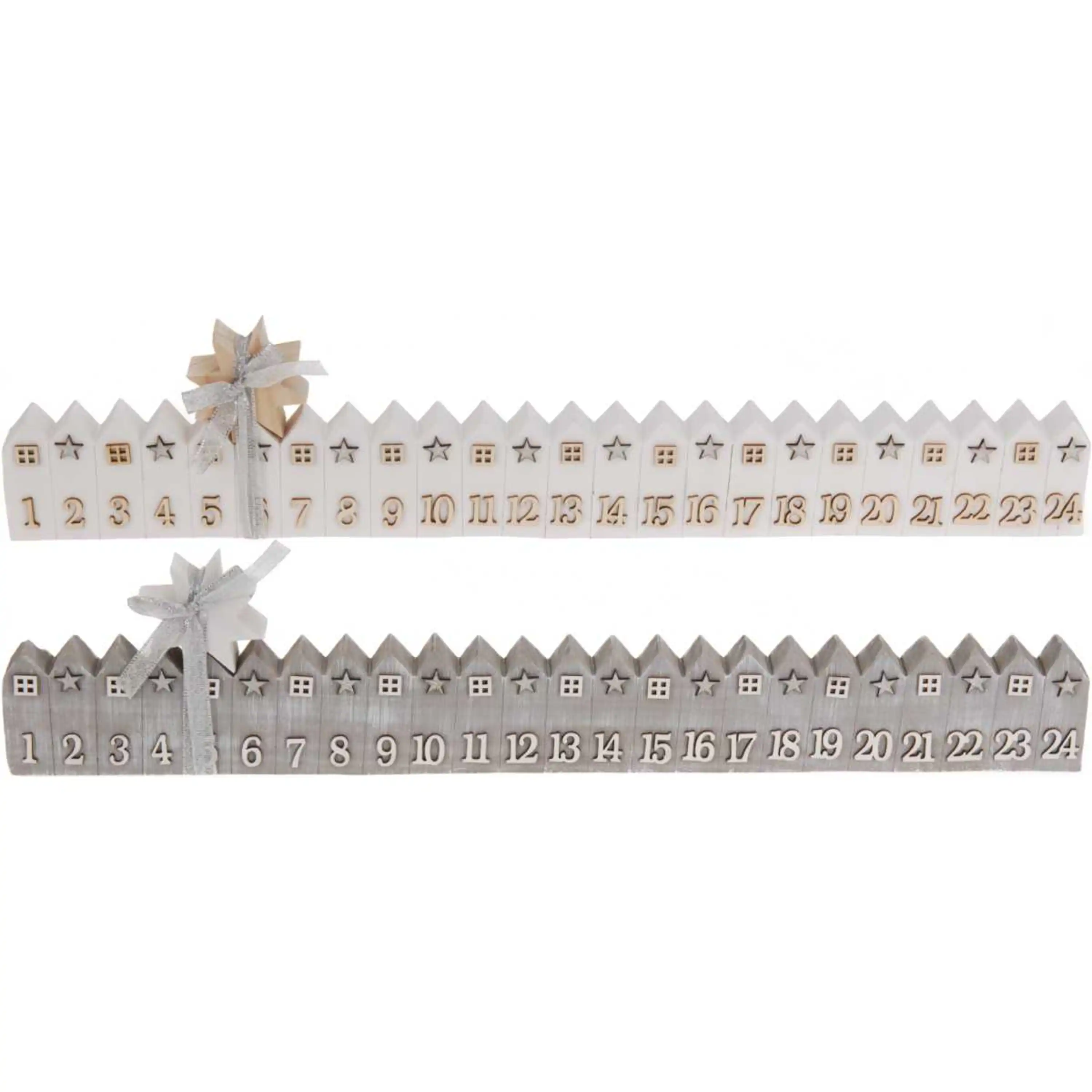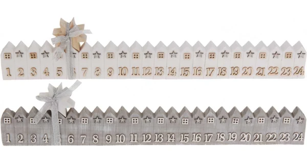 Adventní kalendář v podobě malých dřevěných domečků.