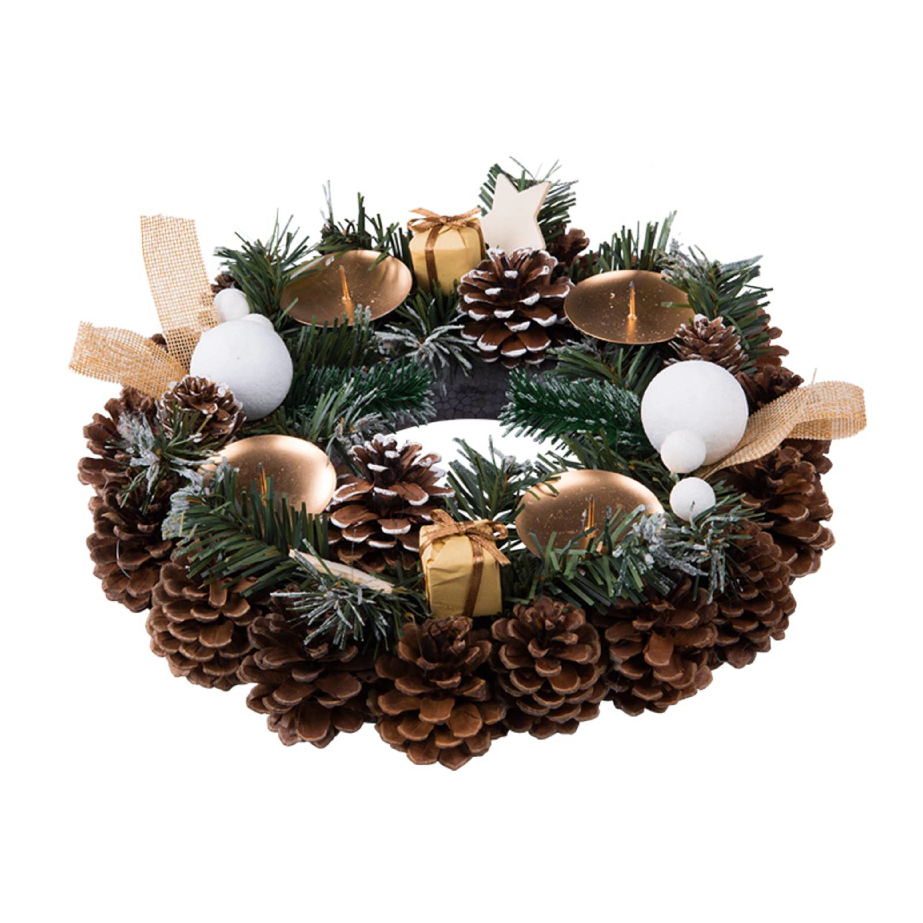 Adventní kulatý věnec z přírodních materiálů šišek a větviček ozdobený dárečky a svíčkami.