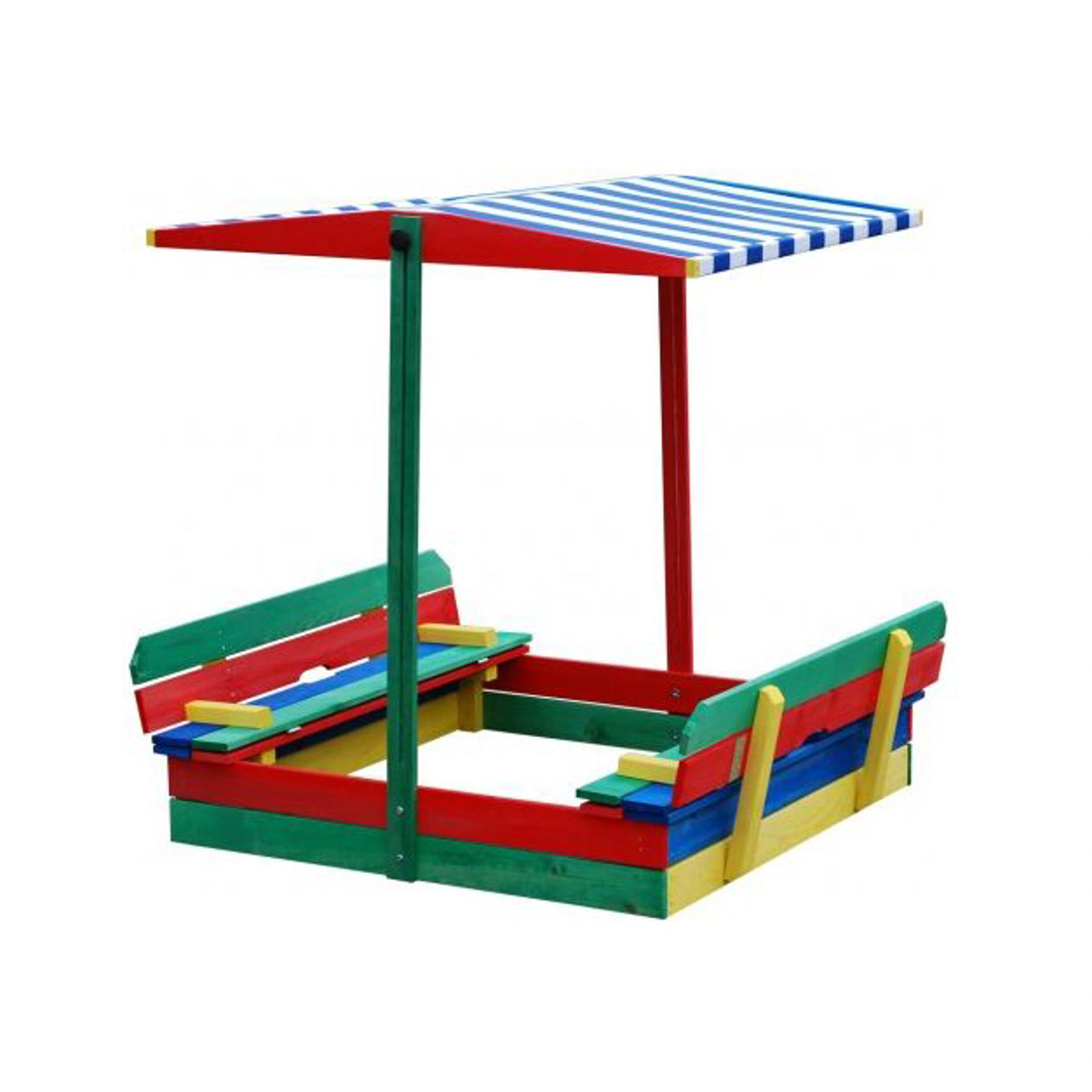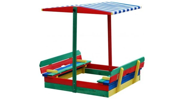 Barevné pískoviště se hodí na každou zahradu či dvorek. Pískoviště nabízí dostatečně velkou plochu pro hraní, je volně přístupné ze všech stran. Při výrobě bylo použito sušené dřevo borovice. Proti povětrnostním vlivům je chráněno zdraví neškodným nátěrem. Všechny prvky pískoviště jsou hoblované. Proti prudkému slunci chrání hrající si děti stříška, kterou je možné spustit téměř až na konstrukci pískoviště a slouží tak jako kryt např. proti spadanému listí.