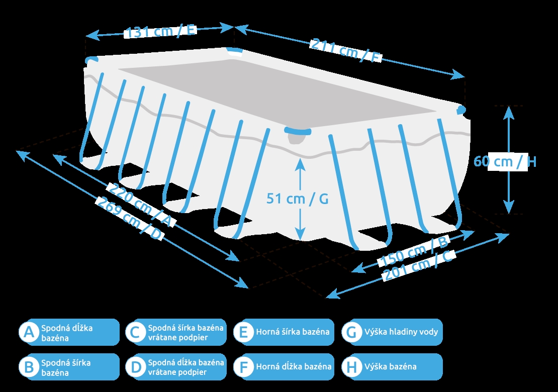 Uvedené rozměry bazénu jsou pouze orientační a ovlivnit je může rovnost podkladu či objem napuštěné vody. Povolená výrobní odchylka je 5 %.