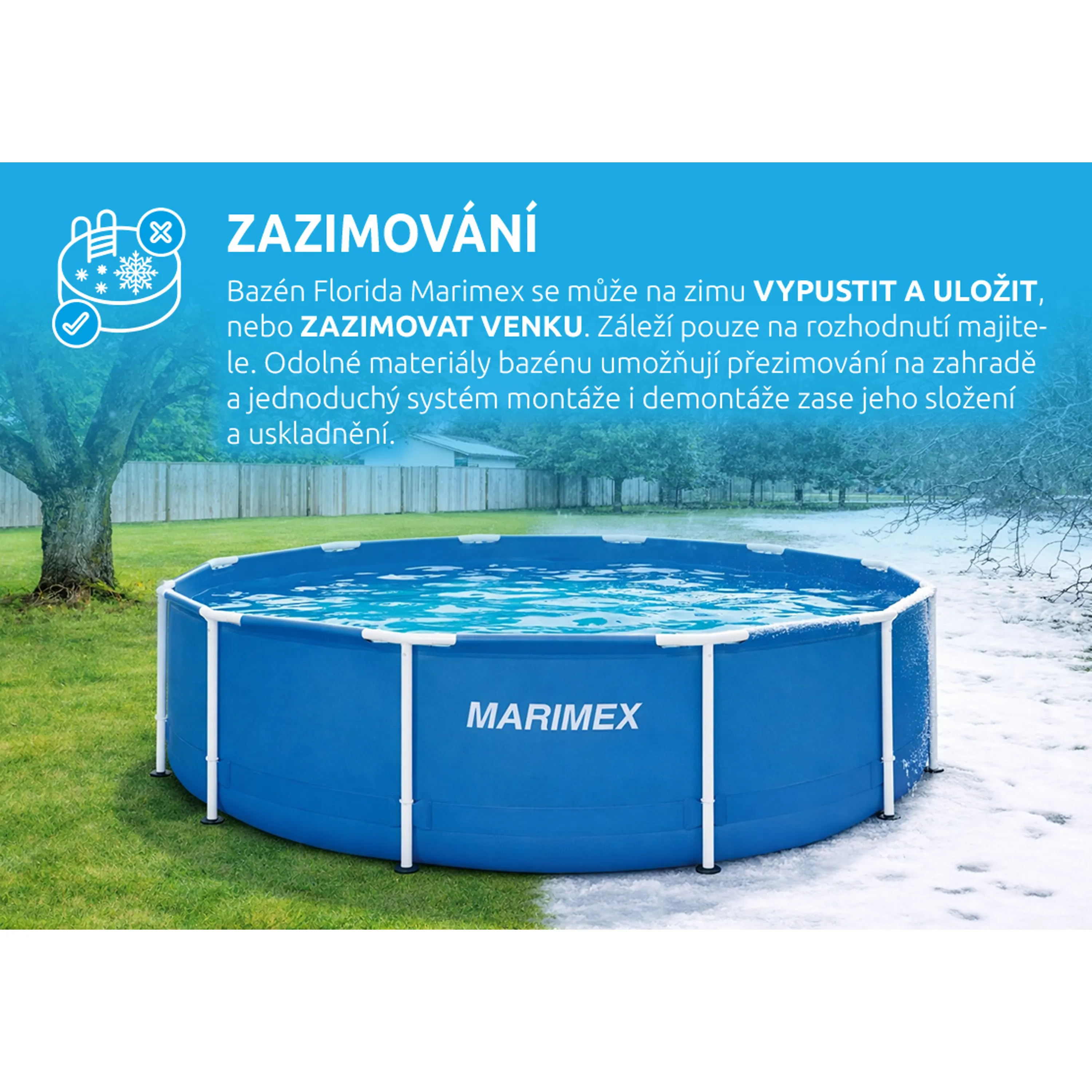 Další předností je, že u bazénu Marimex Florida si můžete vybrat, zda bazén na zimu vypustíte, složíte a uvolníte zahradu pro jiné aktivity, nebo ho zazimujete a ponecháte venku. Tím, že ho necháte na zahradě i mimo koupací sezónu, ušetříte čas, peníze za vodu, a hlavně i samotnou vodu. Při zazimování venku v bazénu zůstane více než 80 % vody, kterou v další sezóně opakovaně využijete. Jedná se o ekologické řešení zazimování bazénu.