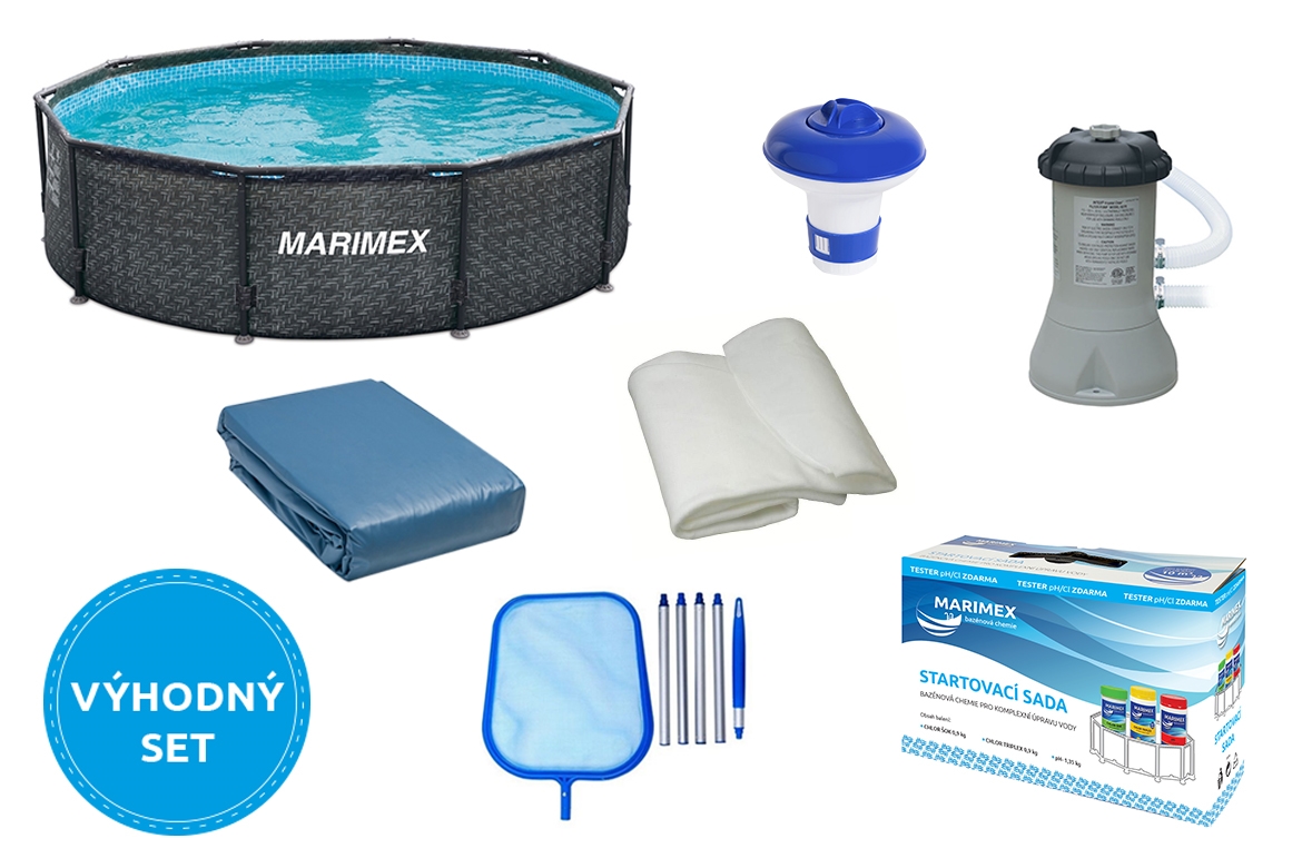 Bazénový set obsahuje všechny potřebné díly na propojení bazénu a filtrace (např. hadice, pásky na upevnění hadic, kartušovou vložku filtrace apod.)