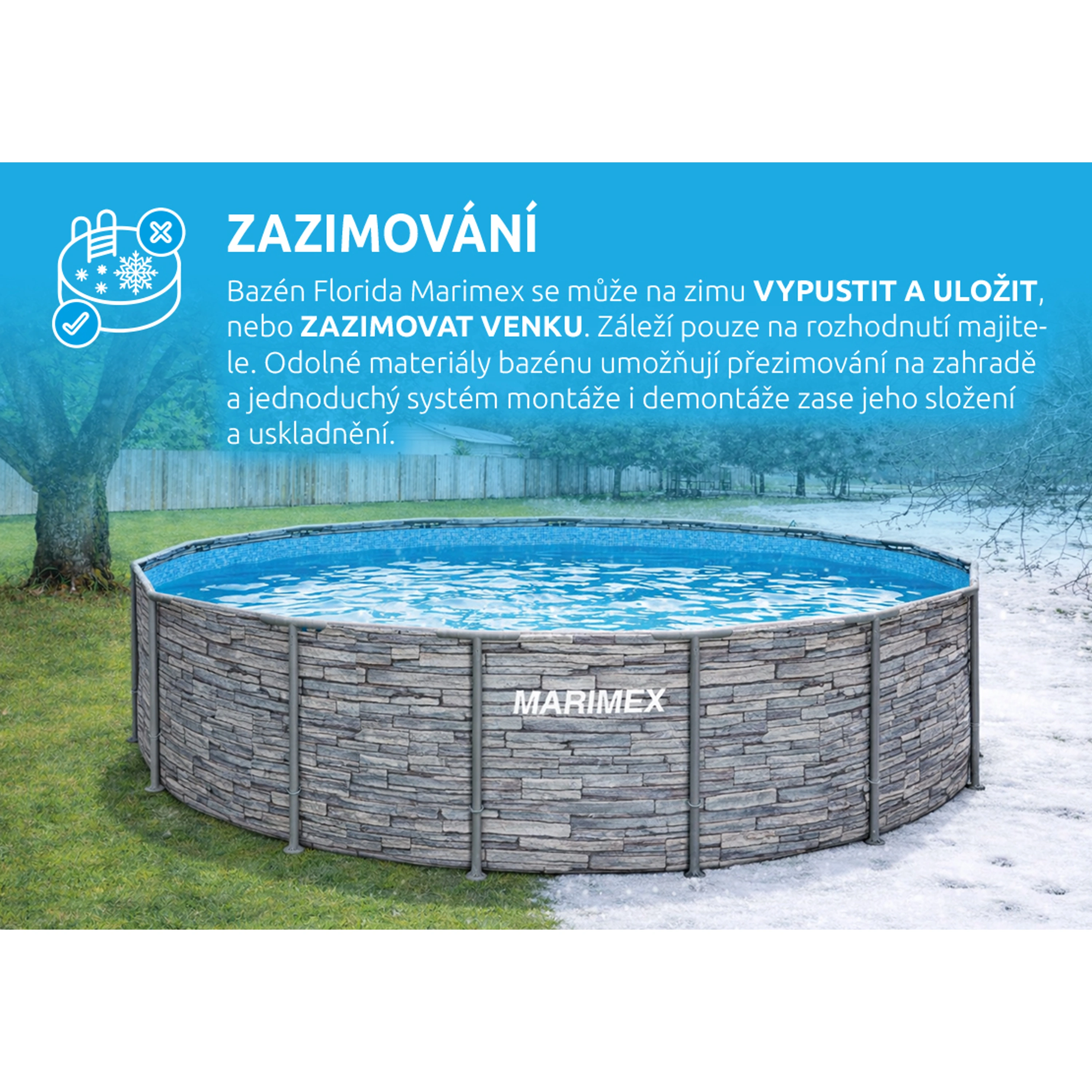 Další předností je, že u bazénu Marimex Florida si můžete vybrat, zda bazén na zimu vypustíte, složíte a uvolníte zahradu pro jiné aktivity, nebo ho zazimujete a ponecháte venku. Tím, že ho necháte na zahradě i mimo koupací sezónu, ušetříte čas, peníze za vodu, a hlavně i samotnou vodu. Při zazimování venku v bazénu zůstane více než 80 % vody, kterou v další sezóně opakovaně využijete. Jedná se o ekologické řešení zazimování bazénu.