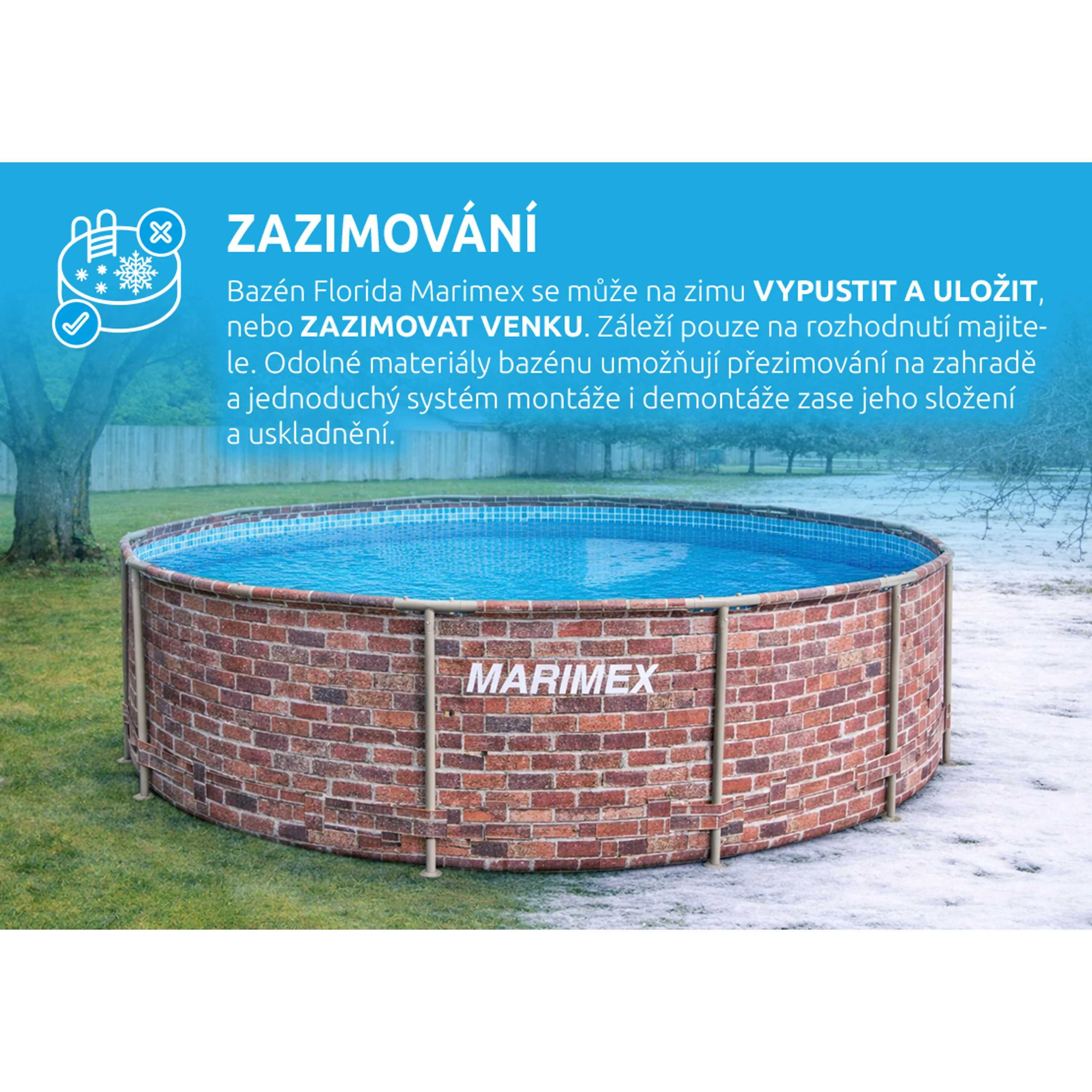 Další předností je, že u bazénu Marimex Florida si můžete vybrat, zda bazén na zimu vypustíte, složíte a uvolníte zahradu pro jiné aktivity, nebo ho zazimujete a ponecháte venku. Tím, že ho necháte na zahradě i mimo koupací sezónu, ušetříte čas, peníze za vodu, a hlavně i samotnou vodu. Při zazimování venku v bazénu zůstane více než 80 % vody, kterou v další sezóně opakovaně využijete. Jedná se o ekologické řešení zazimování bazénu.