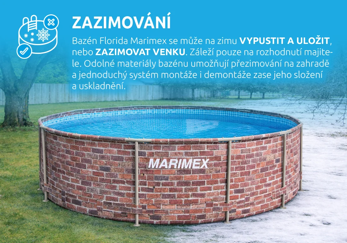 Další předností je, že u bazénu Marimex Florida si můžete vybrat, zda bazén na zimu vypustíte, složíte a uvolníte zahradu pro jiné aktivity, nebo ho zazimujete a ponecháte venku. Tím, že ho necháte na zahradě i mimo koupací sezónu, ušetříte čas, peníze za vodu, a hlavně i samotnou vodu. Při zazimování venku v bazénu zůstane více než 80 % vody, kterou v další sezóně opakovaně využijete. Jedná se o ekologické řešení zazimování bazénu.