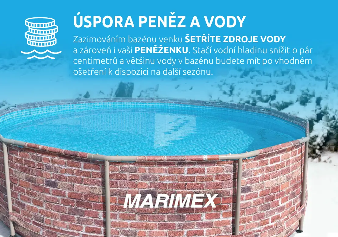 Úspora peněz a vodyZazimováním bazénu venku se šetří vodní zdroje a zároveň snižují náklady na vodné a stočné. Vhodně ošetřená bazénová voda vydrží do další koupací sezóny a nebude potřeba bazén znovu kompletně napouštět. |