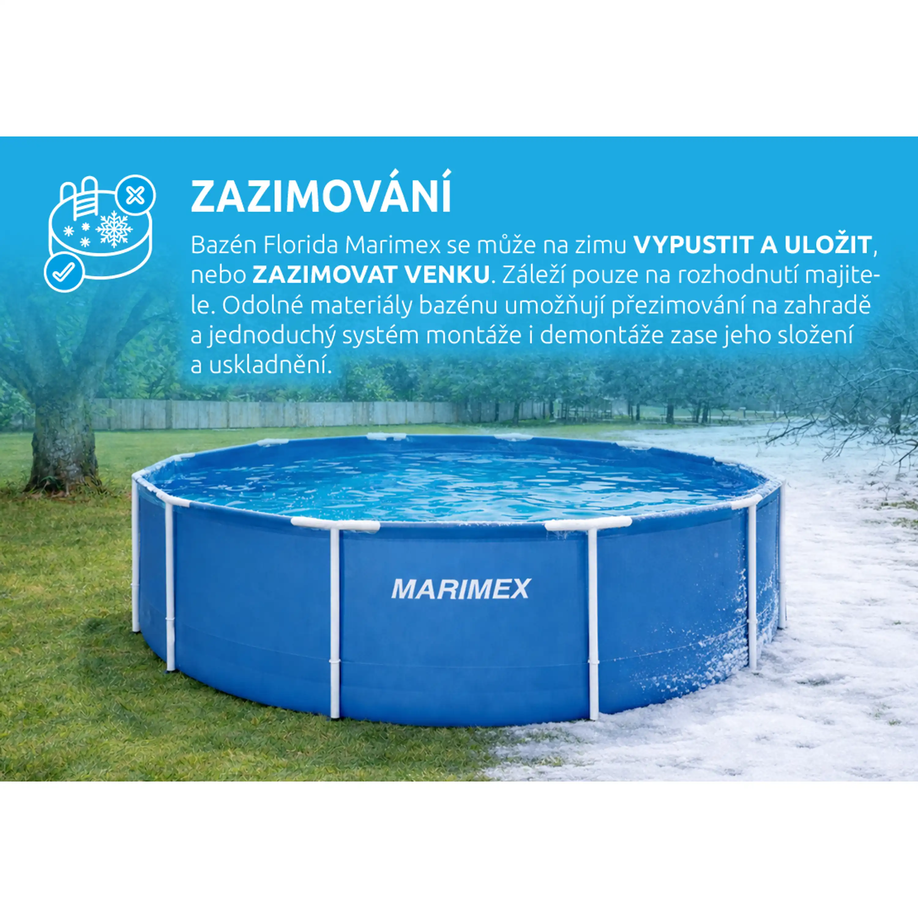 Další předností je, že u bazénu Marimex Florida si můžete vybrat, zda bazén na zimu vypustíte, složíte a uvolníte zahradu pro jiné aktivity, nebo ho zazimujete a ponecháte venku. Tím, že ho necháte na zahradě i mimo koupací sezónu, ušetříte čas, peníze za vodu, a hlavně i samotnou vodu. Při zazimování venku v bazénu zůstane více než 80 % vody, kterou v další sezóně opakovaně využijete. Jedná se o ekologické řešení zazimování bazénu.