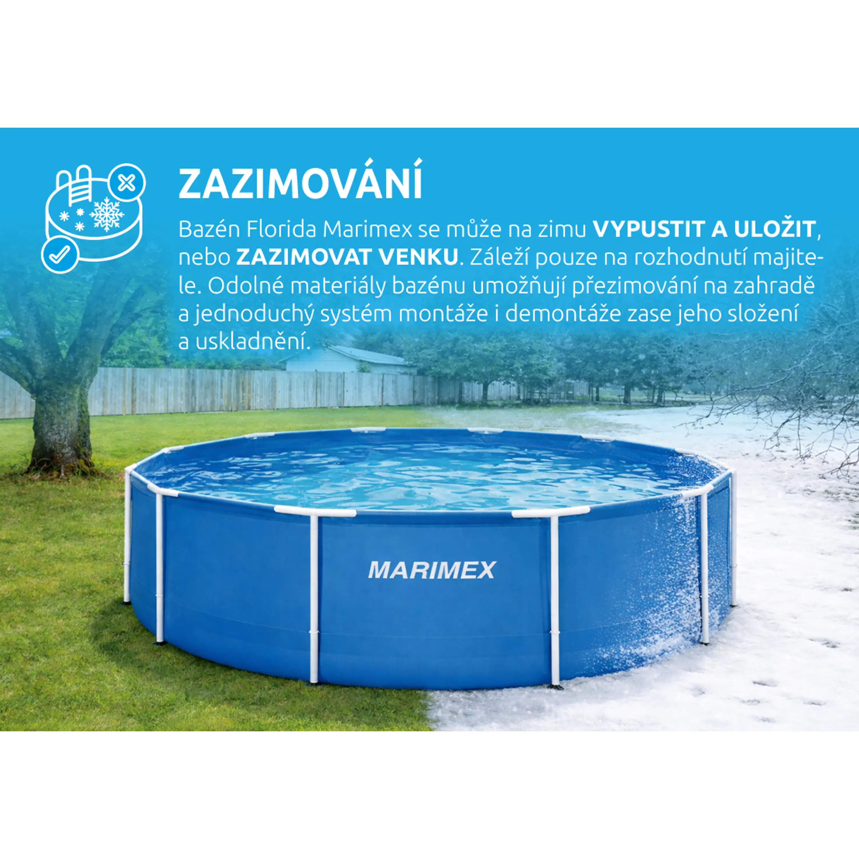 Další předností je, že u bazénu Marimex Florida si můžete vybrat, zda bazén na zimu vypustíte, složíte a uvolníte zahradu pro jiné aktivity, nebo ho zazimujete a ponecháte venku. Tím, že ho necháte na zahradě i mimo koupací sezónu, ušetříte čas, peníze za vodu, a hlavně i samotnou vodu. Při zazimování venku v bazénu zůstane více než 80 % vody, kterou v další sezóně opakovaně využijete. Jedná se o ekologické řešení zazimování bazénu.