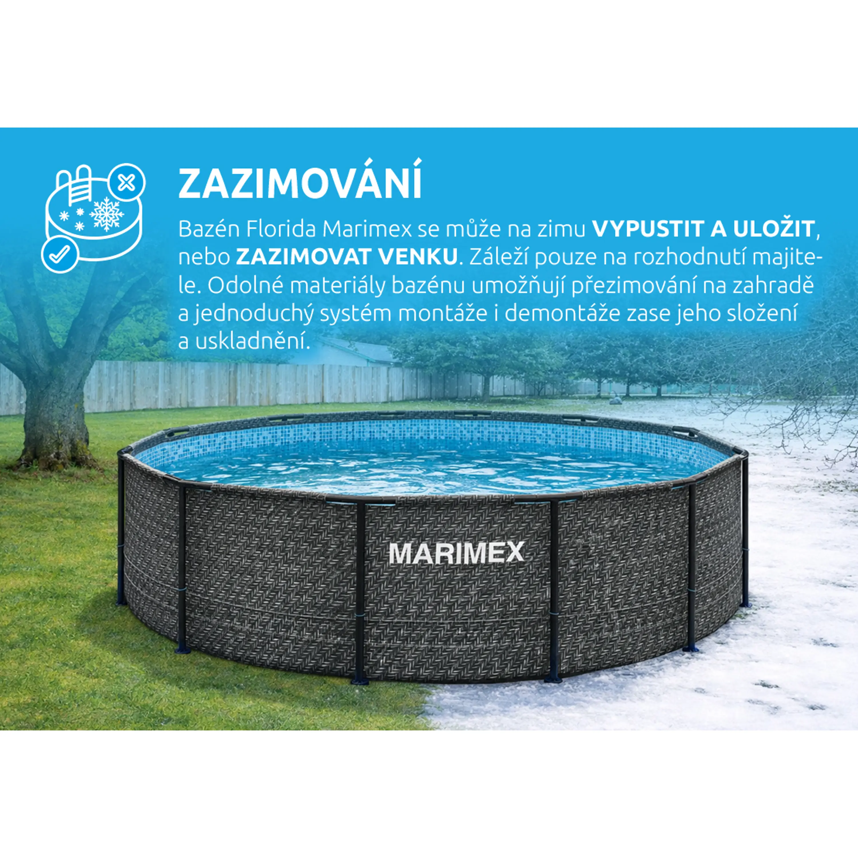 Další předností je, že u bazénu Marimex Florida si můžete vybrat, zda bazén na zimu vypustíte, složíte a uvolníte zahradu pro jiné aktivity, nebo ho zazimujete a ponecháte venku. Tím, že ho necháte na zahradě i mimo koupací sezónu, ušetříte čas, peníze za vodu, a hlavně i samotnou vodu. Při zazimování venku v bazénu zůstane více než 80 % vody, kterou v další sezóně opakovaně využijete. Jedná se o ekologické řešení zazimování bazénu.