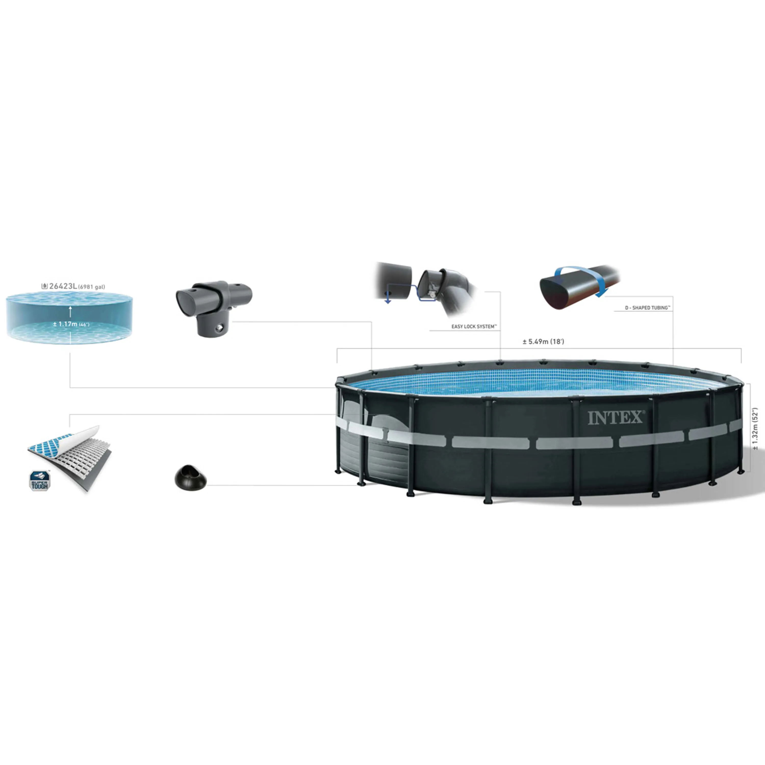 Bazénovou plachtu vypíná pevná kovová konstrukce s plastovými T-spoji, která umožňuje, aby byly bazény vyráběny i ve velkých rozměrech. Široká vodní plocha tak poskytuje dostatečný prostor ke koupání.