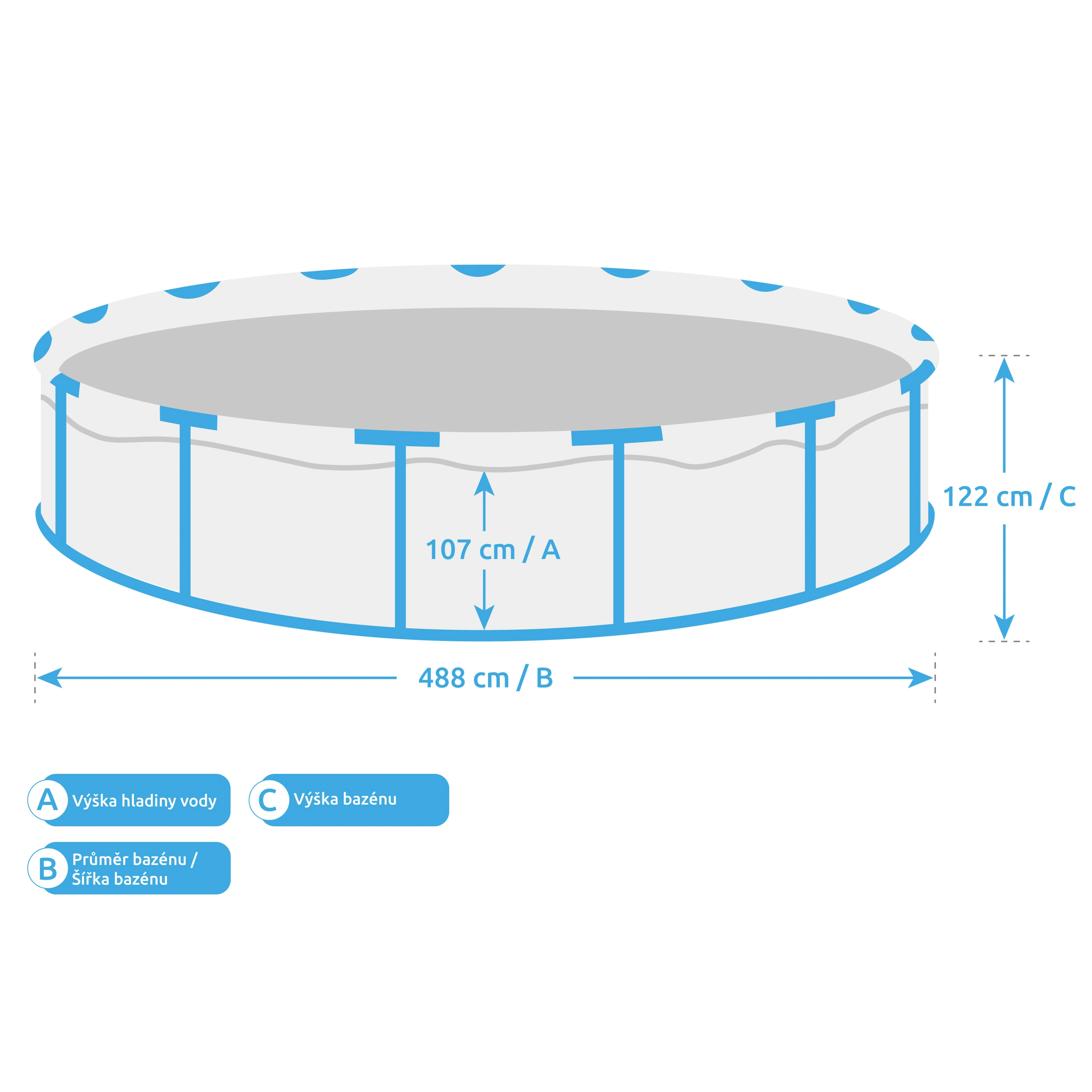 Uvedené rozměry bazénu jsou pouze orientační a ovlivnit je může rovnost podkladu či objem napuštěné vody. Povolená výrobní odchylka je 5 %.