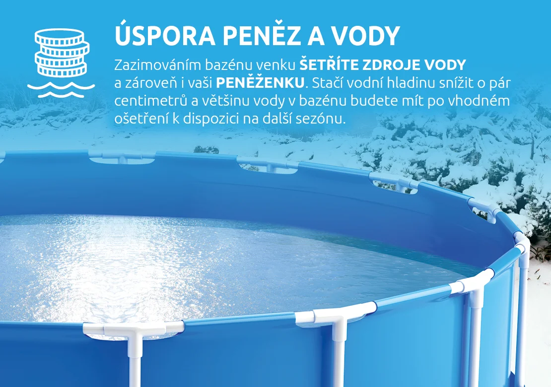 Úspora peněz a vodyZazimováním bazénu venku se šetří vodní zdroje a zároveň snižují náklady na vodné a stočné. Vhodně ošetřená bazénová voda vydrží do další koupací sezóny a nebude potřeba bazén znovu kompletně napouštět. |