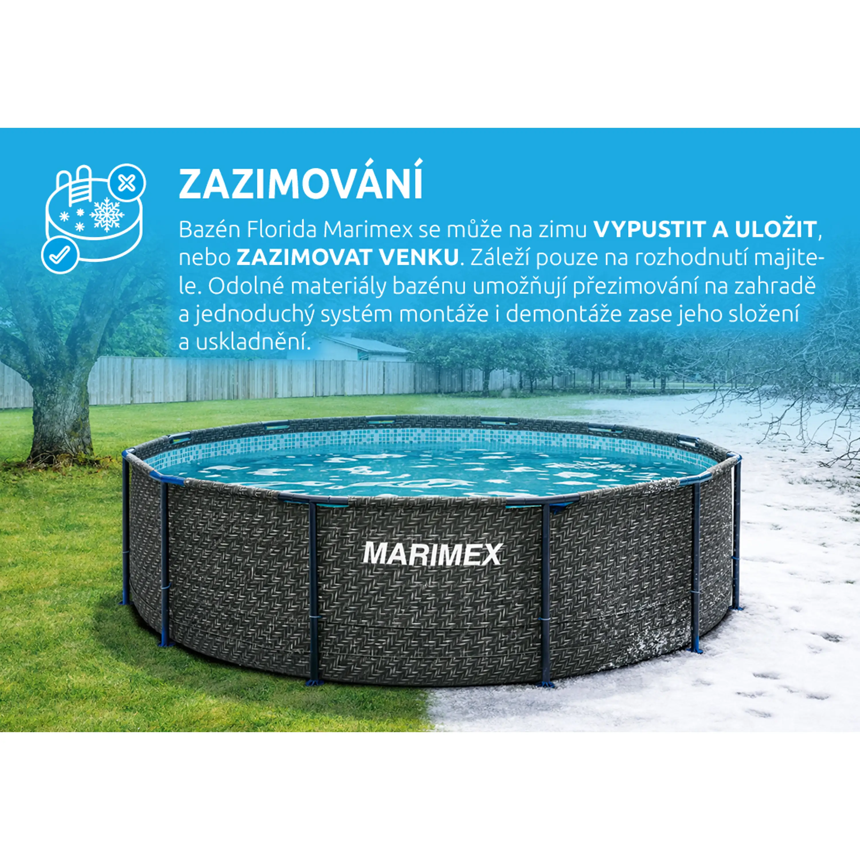 U bazénu Florida Marimex si můžete vybrat, zda bazén vypustíte, složíte a uvolníte zahradu pro jiné aktivity, nebo ho zazimujete a ponecháte venku. Materiály bazénu jsou odolné a uzpůsobené pro zazimování v zimě.
