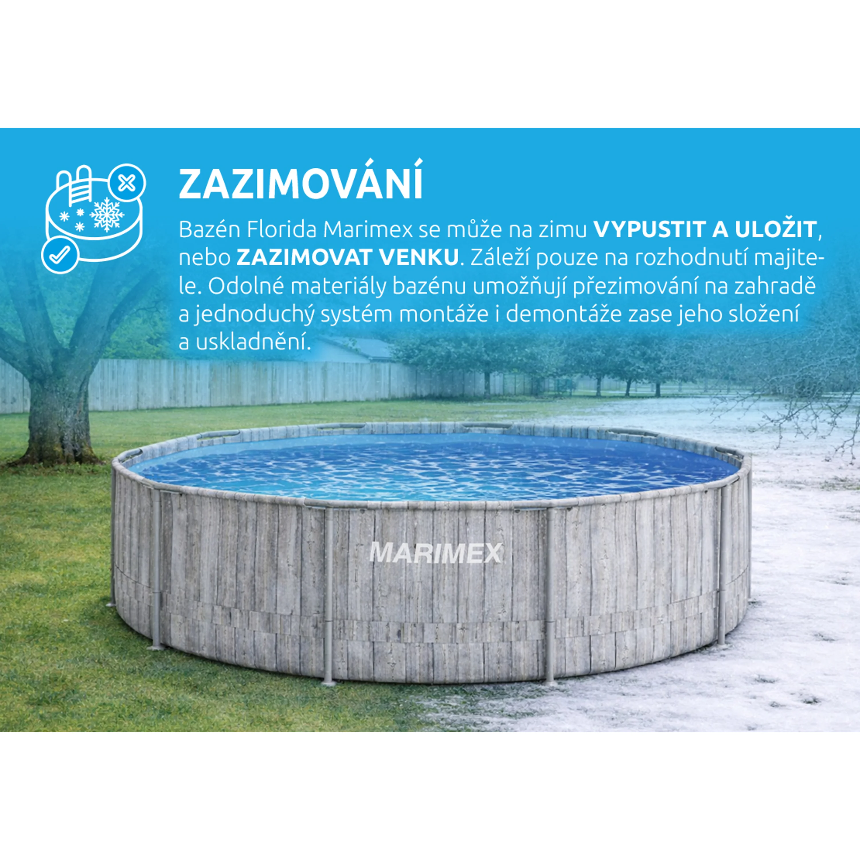 Další předností je, že u bazénu Marimex Florida si můžete vybrat, zda bazén na zimu vypustíte, složíte a uvolníte zahradu pro jiné aktivity, nebo ho zazimujete a ponecháte venku. Tím, že ho necháte na zahradě i mimo koupací sezónu, ušetříte čas, peníze za vodu, a hlavně i samotnou vodu. Při zazimování venku v bazénu zůstane více než 80 % vody, kterou v další sezóně opakovaně využijete. Jedná se o ekologické řešení zazimování bazénu.