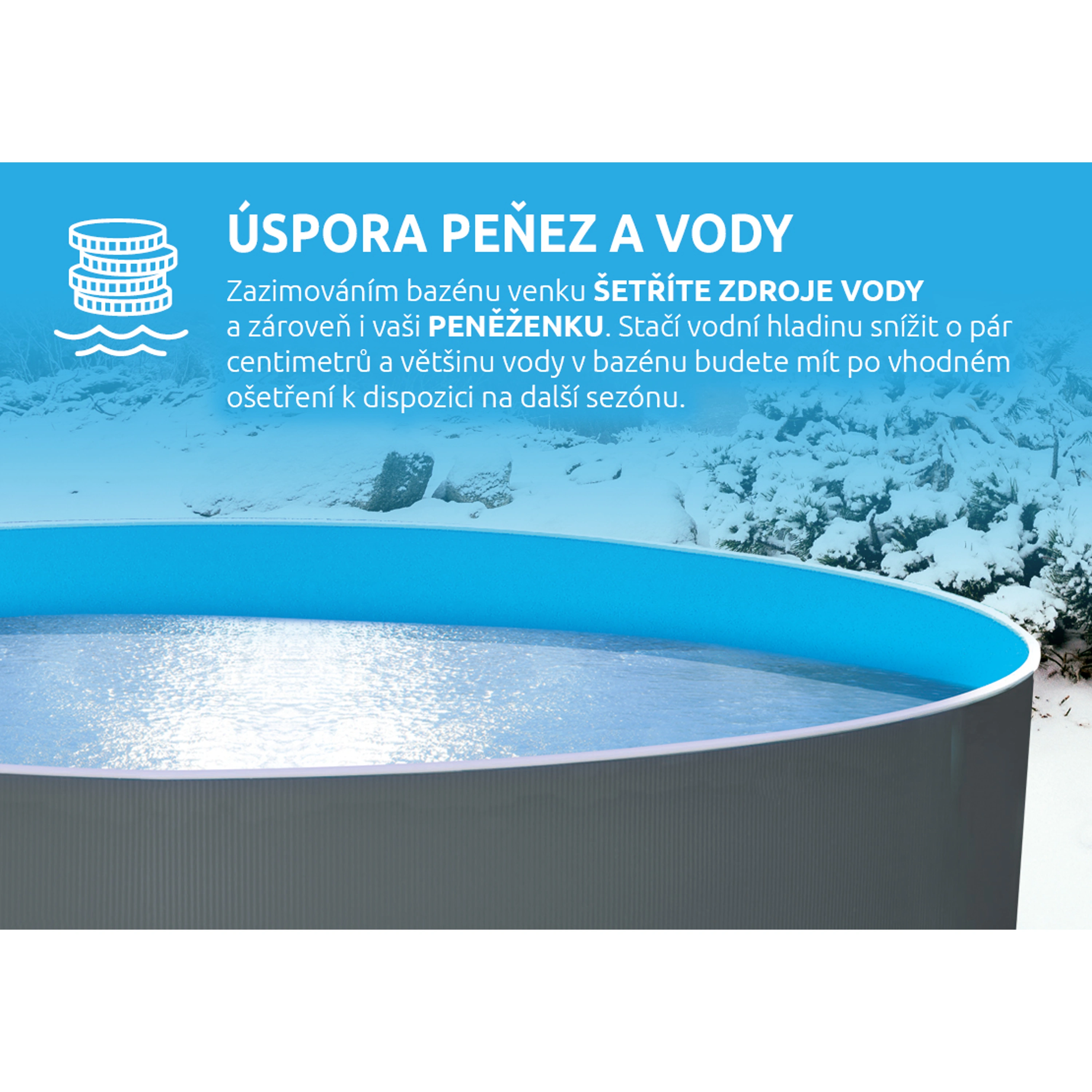 Úspora peněz a vodyZazimováním bazénu venku se šetří vodní zdroje a zároveň snižují náklady na vodné a stočné. Vhodně ošetřená bazénová voda vydrží do další koupací sezóny a nebude potřeba bazén znovu kompletně napouštět. |