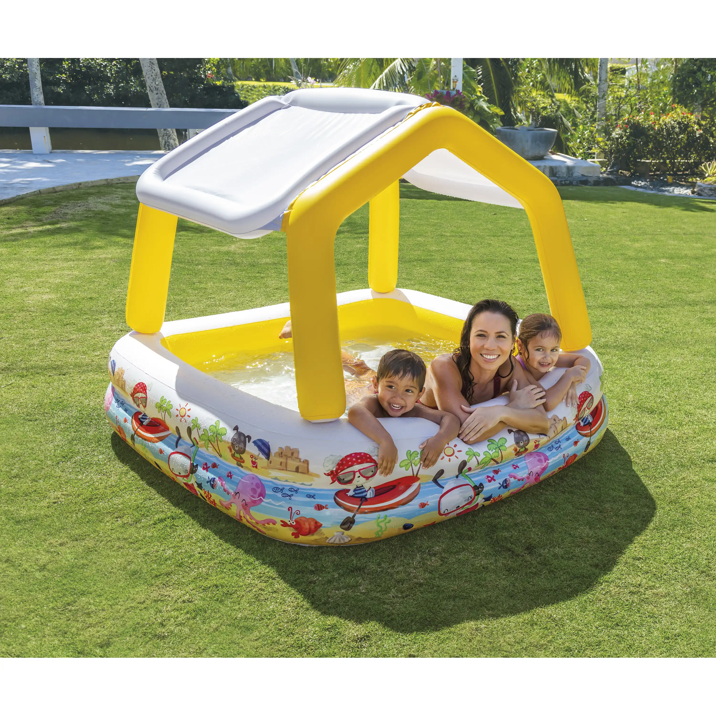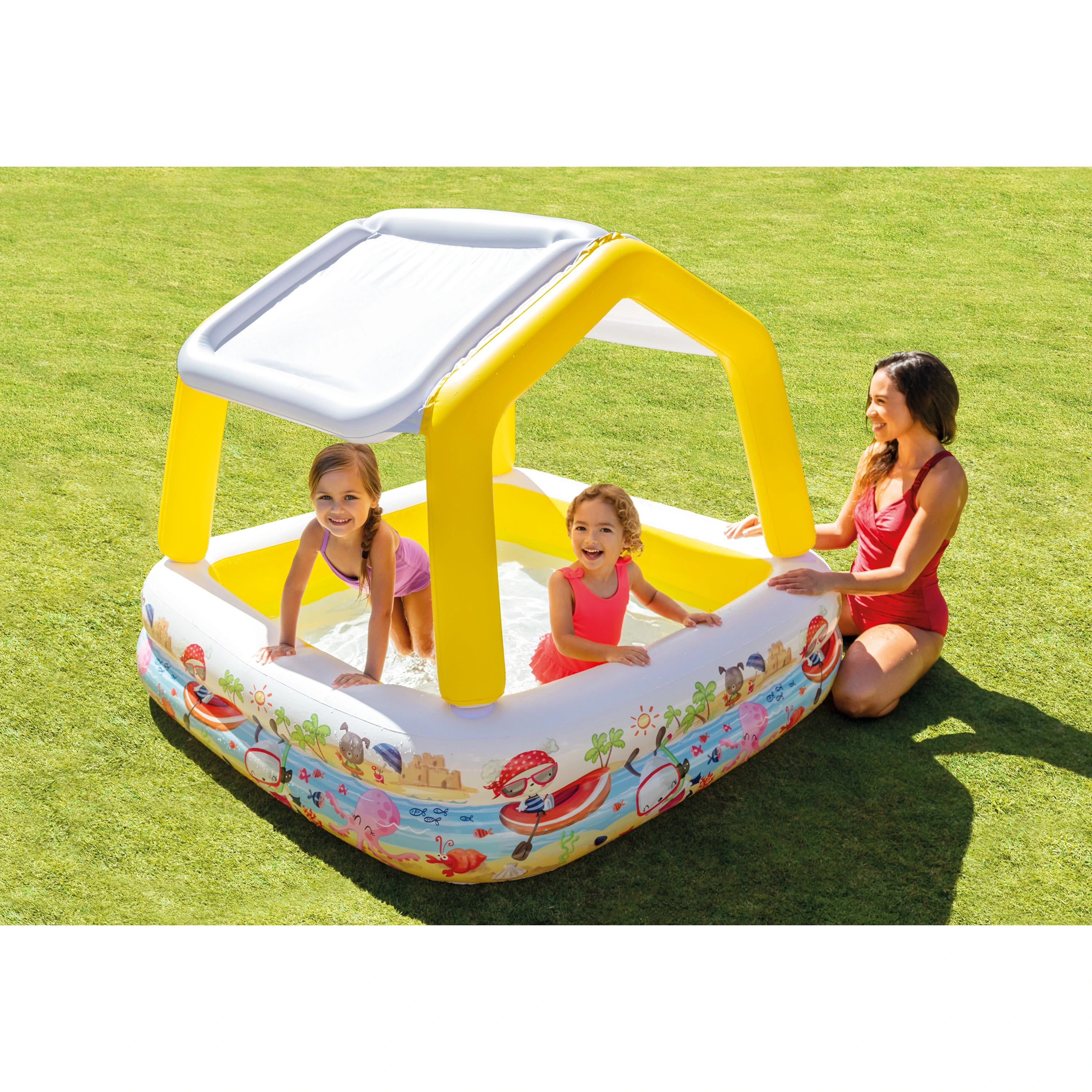 Krásný dětský nafukovací bazének se stříškou, která chrání před sluncem, připevňuje se pomocí suchého zipu. Nafukovací hračky a potřeby Intex splňují nejpřísnější bezpečnostní normy na zpracování a použité materiály. Vyrobeno z testovaného masivního vinylu. Proti poškození doporučujeme dokoupit podložku.