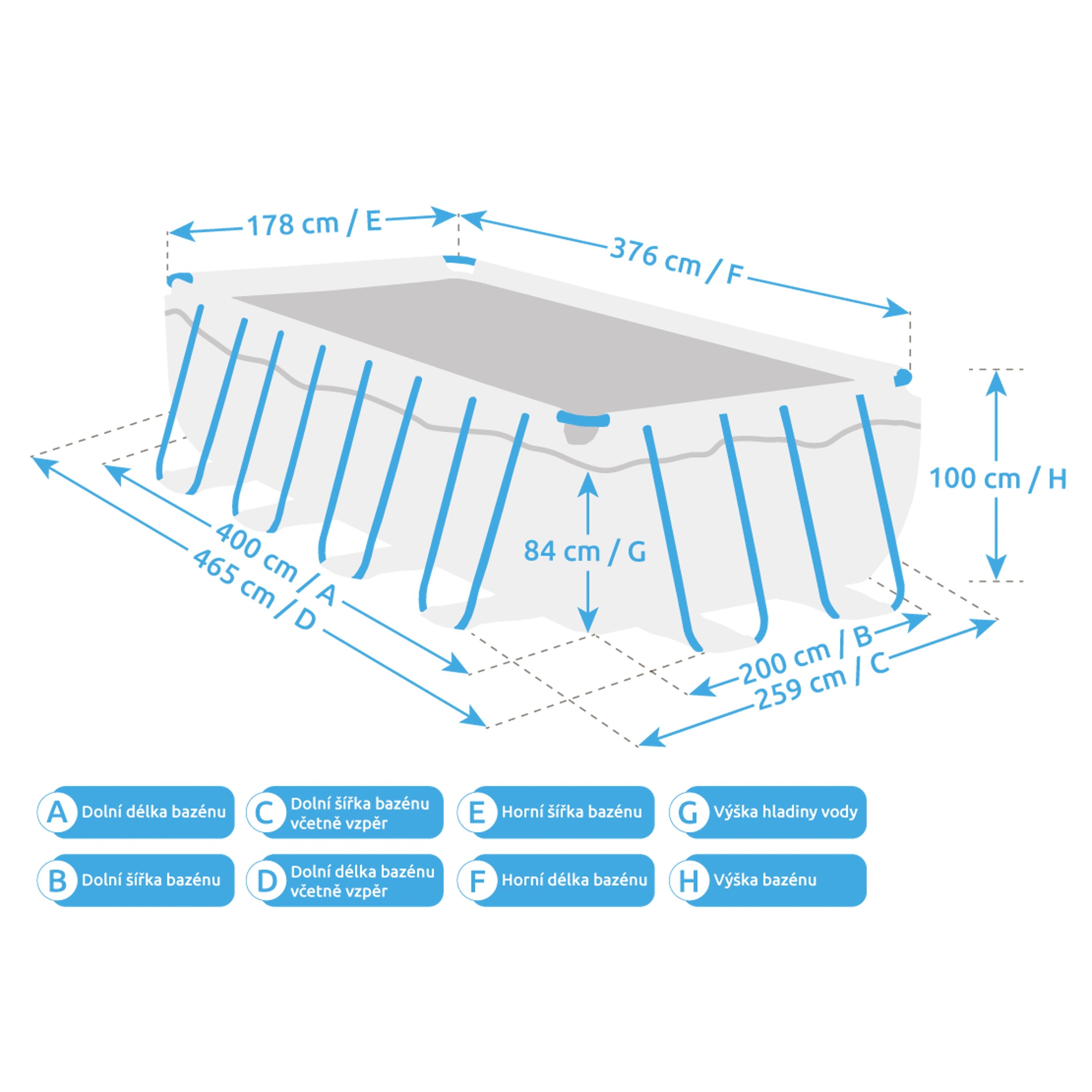 Rozměry včetně vzpěr: 4,65 x 2,59 m