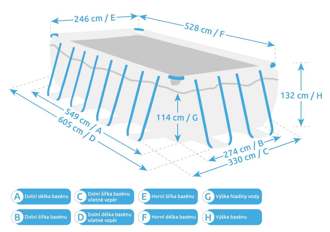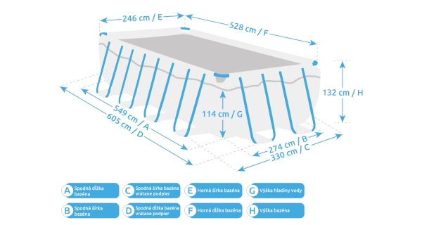 Uvedené rozměry bazénu jsou pouze orientační a ovlivnit je může rovnost podkladu či objem napuštěné vody. Povolená výrobní odchylka je 5 %.