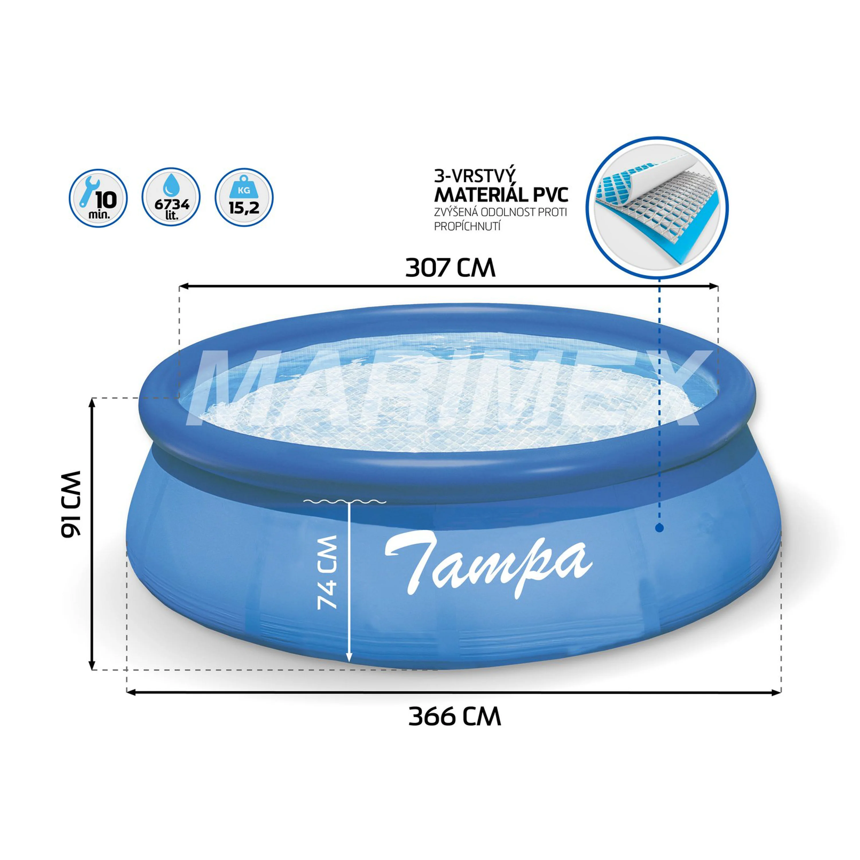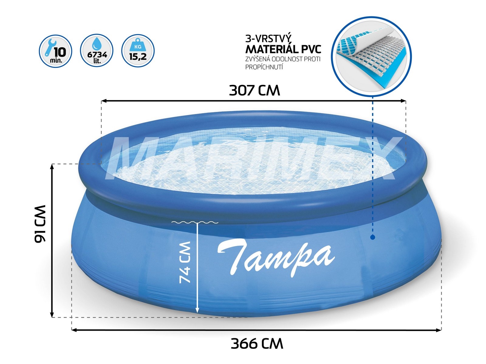 Bazén Tampa se řadí mezi nejprodávanější a nejoblíbenější bazény v České republice. Koupání ve vlastním bazénu si může dopřát opravdu každý. Předností bazénu Tampa je nízká cena, snadná údržba i rychlé zprovoznění. Stačí jen připravit místo na bazén, rozvinout bazénovou podložku, bazén rozbalit, nafouknout horní límec a začít napouštět vodu. Stoupající voda sama bazén postaví. Od vybalení bazénu můžete do 10 minut napouštět vodu. Bazén je nutné po skončení bazénové sezony vyčistit, vypustit a uklidit na suché, nemrznoucí místo. Správnou údržbou prodloužíte životnost bazénu. Doporučujeme bazén po koupání zakrývat krycí plachtou. Pro snadné nafouknutí doporučujeme zakoupit ruční či elektrickou pumpu.