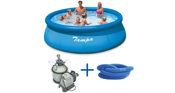 Bazén Tampa se řadí mezi neprodávanější a nejoblíbenější bazény v České republice. Koupání ve vlastním bazénu si může dopřát opravdu každý. Předností bazénu Tampa je nízká cena, snadná údržba i rychlé zprovoznění. Stačí jen připravit místo na bazén, rozvinout bazénovou podložku, bazén rozbalit, nafouknout horní límec a začít napouštět vodu. Stoupající voda sama bazén postaví. Od vybalení bazénu můžete do 10 minut napouštět vodu. Bazén je nutné po skončení bazénové sezony vyčistit, vypustit a uklidit na suché, nemrznoucí místo. Správnou údržbou prodloužíte životnost bazénu. Doporučujeme bazén po koupání zakrývat krycí plachtou. Pro snadné nafouknutí doporučujeme zakoupit ruční či elektrickou pumpu.