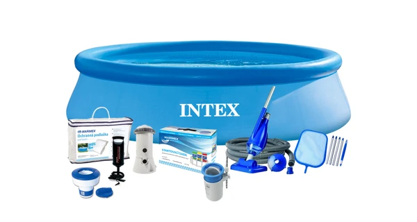 Bazénový set obsahuje všechny potřebné díly na propojení bazénu a filtrace (např. hadice, pásky na upevnění hadic, kartušovou vložku filtrace apod.)