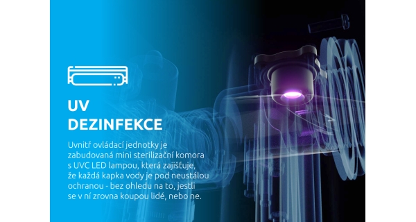 Uvnitř ovládací jednotky je zabudovaná mini sterilizační komora s UVC LED lampou, která zajišťuje, že každá kapka vody v Mspa je pod neustálou ochranou - bez ohledu na to, jestli se v ní zrovna koupou lidé nebo ne. Testy ukazují, že tato lampa dokáže za 4 hodiny zahubit 52% bakterií. UV LED lampa nemůže poškodit vaše oči ani pokožku, jelikož je kompletně uzavřena uvnitř čerpadla. Narozdíl od UVA nebo UVB záření UVC nemá vliv na životnost. Vlnová délka UVC záření je pečlivě nastavena tak. aby neovlivnila životnost ostatních částí vany. Spotřeba tohoto UVC systému je velice nízká.