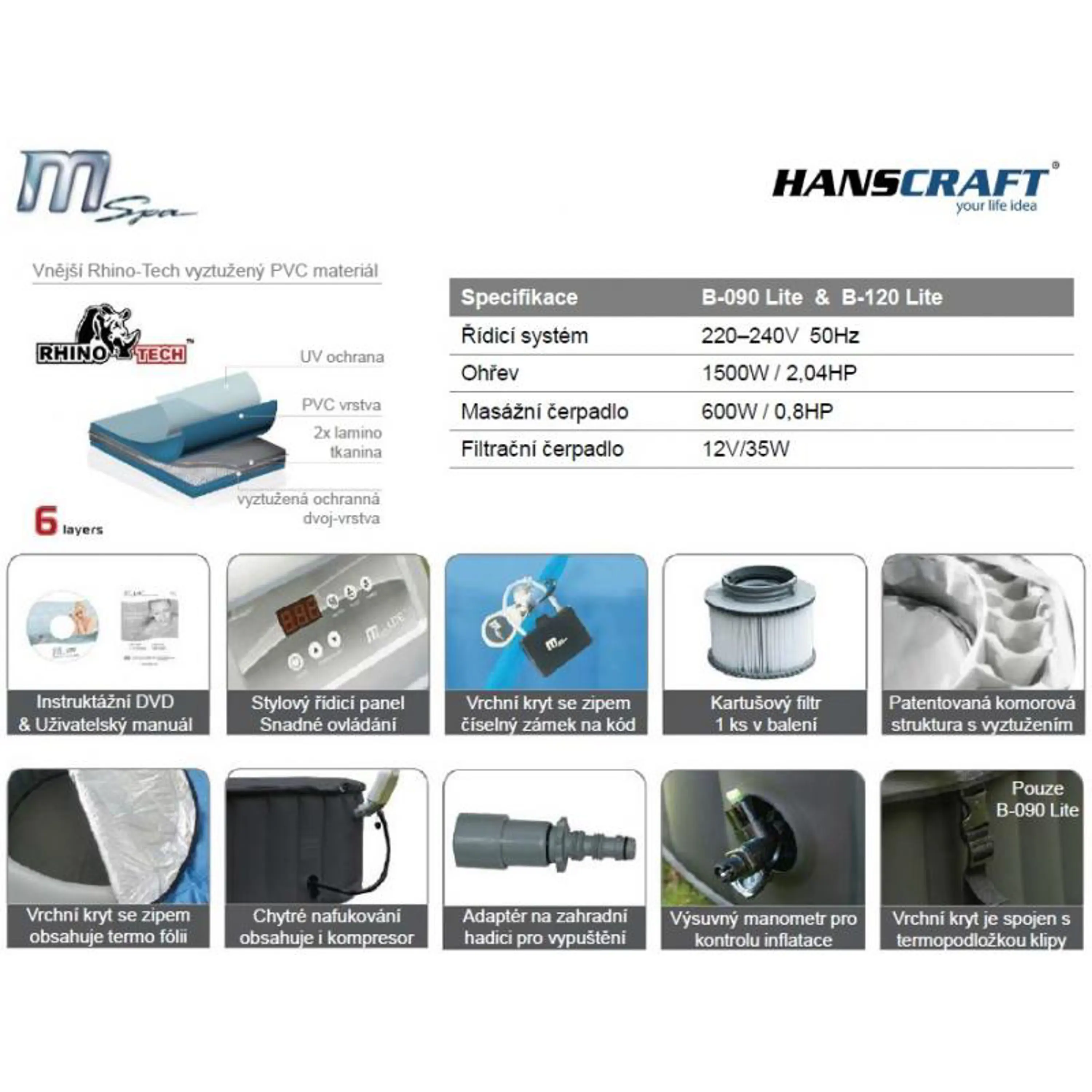 MSpa M-022LS Sapphire LITE je vyrobena z patentovaného šestivrstvého PVC – Rhino-Tech materiálu, který zaručuje vysokou a dlouhou životnost nafukovací vířivky. Jako u všech modelů, tuto mobilní vířivku MSpa nafouknete pomocí zabudovaného kompresoru v řídící jednotce propojením nafukovací hadice s kontrolním panelem. Vlastní nafouknutí a instalace netrvá déle než 10 minut!