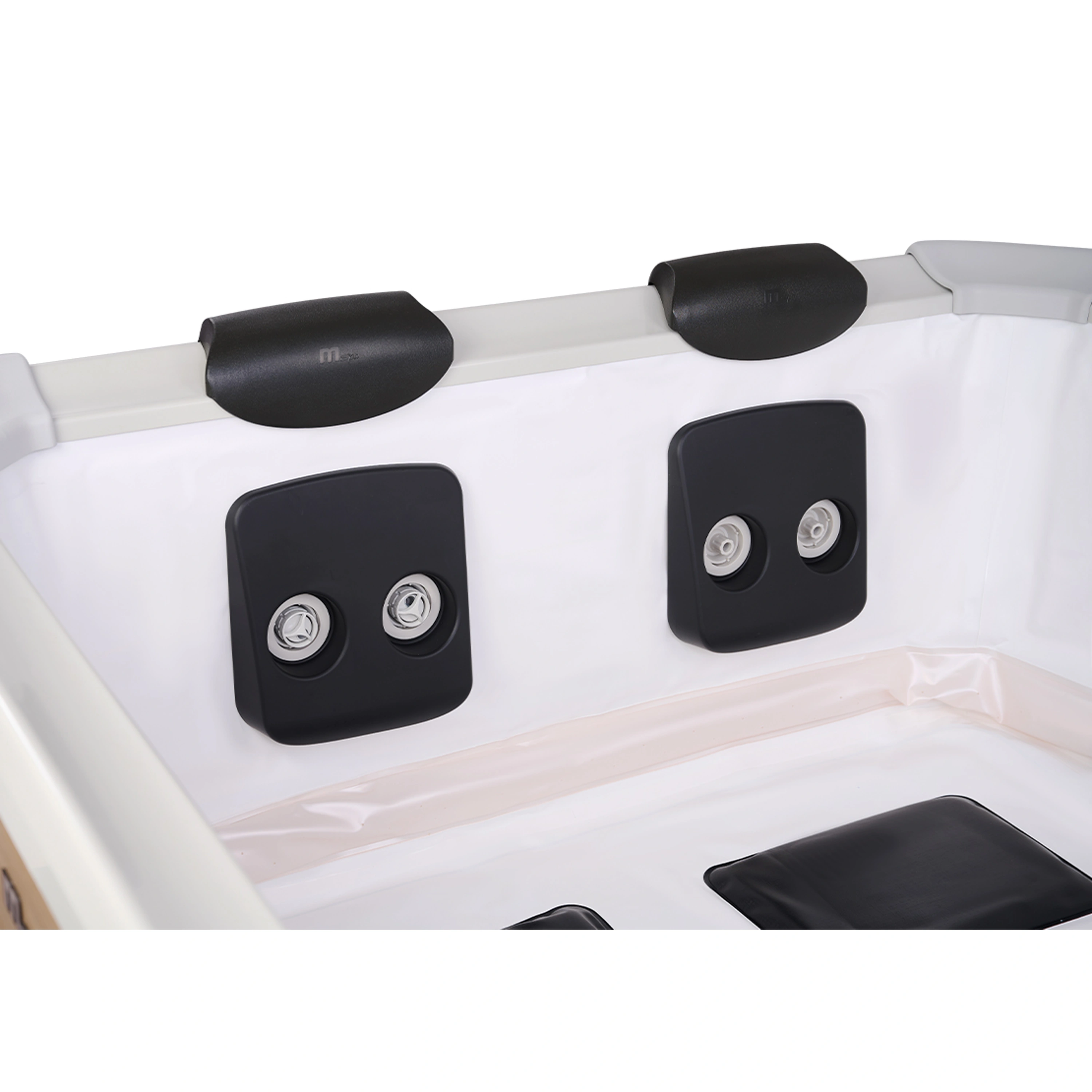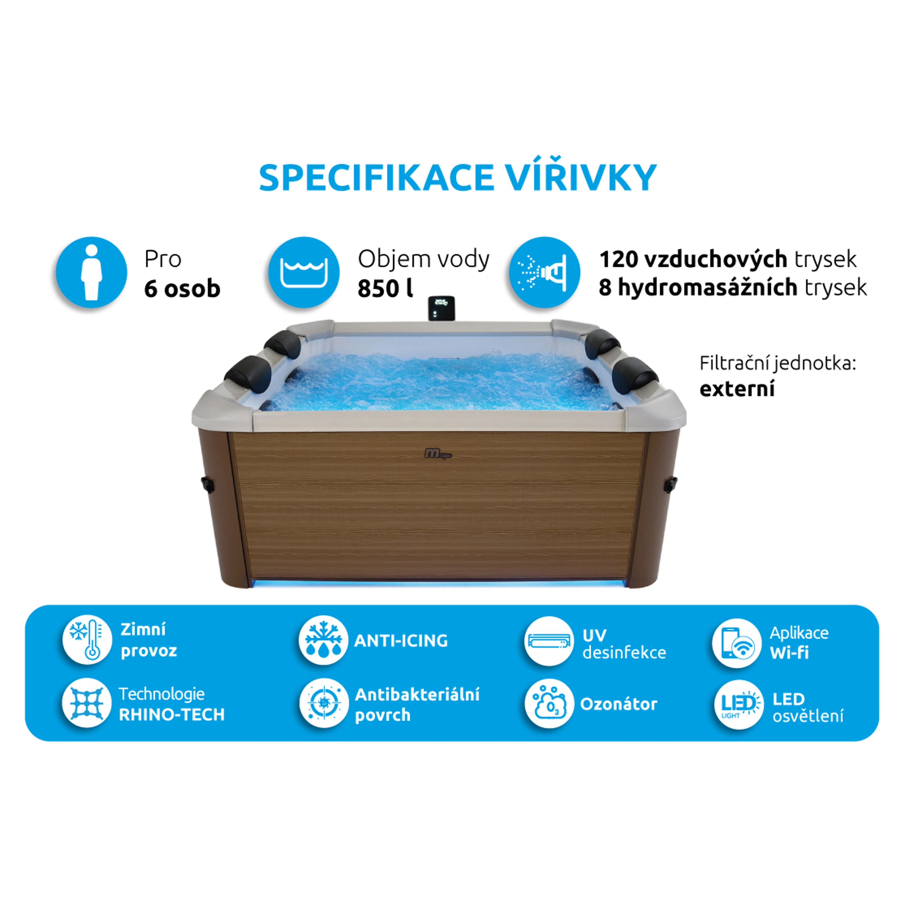 Je vybavena 120 vzduchovými a 8 nastavitelnými hydromasážními tryskami a samozřejmě i účinným ohřevem vody. Obsahuje také vrchní kryt, který pomůže udržet teplotu vody stále vysoko. Bezpečnostní klipsny zajistí, že zůstane bezpečně uzavřená.