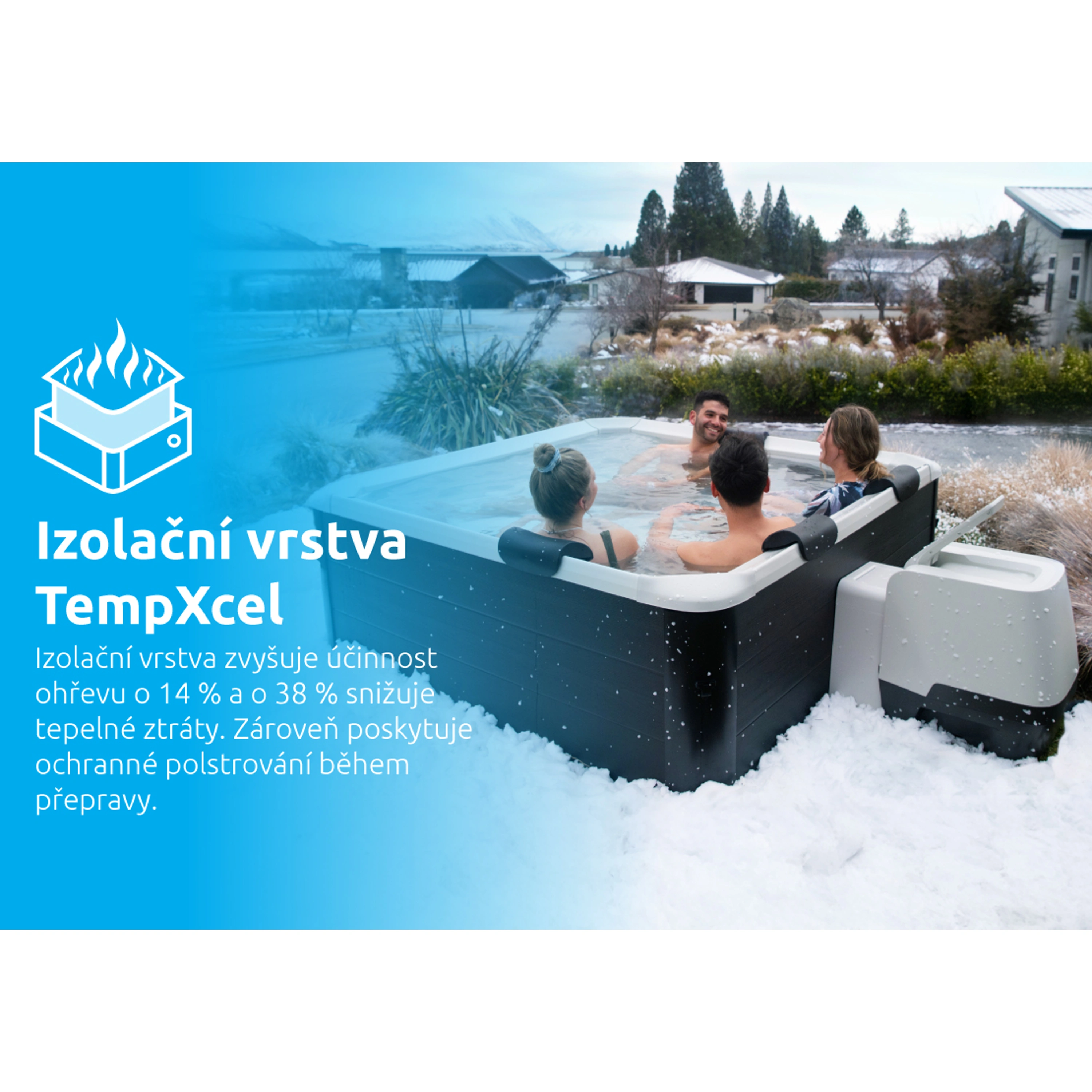 Systém ANTI-ICING bude neustále dohlížet na vaši vířivou vanu a hlídat bezpečnou úroveň teploty. Pokud teplota vody poklesne pod 1°C, ohřev se automaticky spustí, dokud teplota vody nestoupne na 3°C. Toto zabrání vodě v zamrznutí a ochrání tak cirkulační systém, čerpadlo a trubky před poškozením.