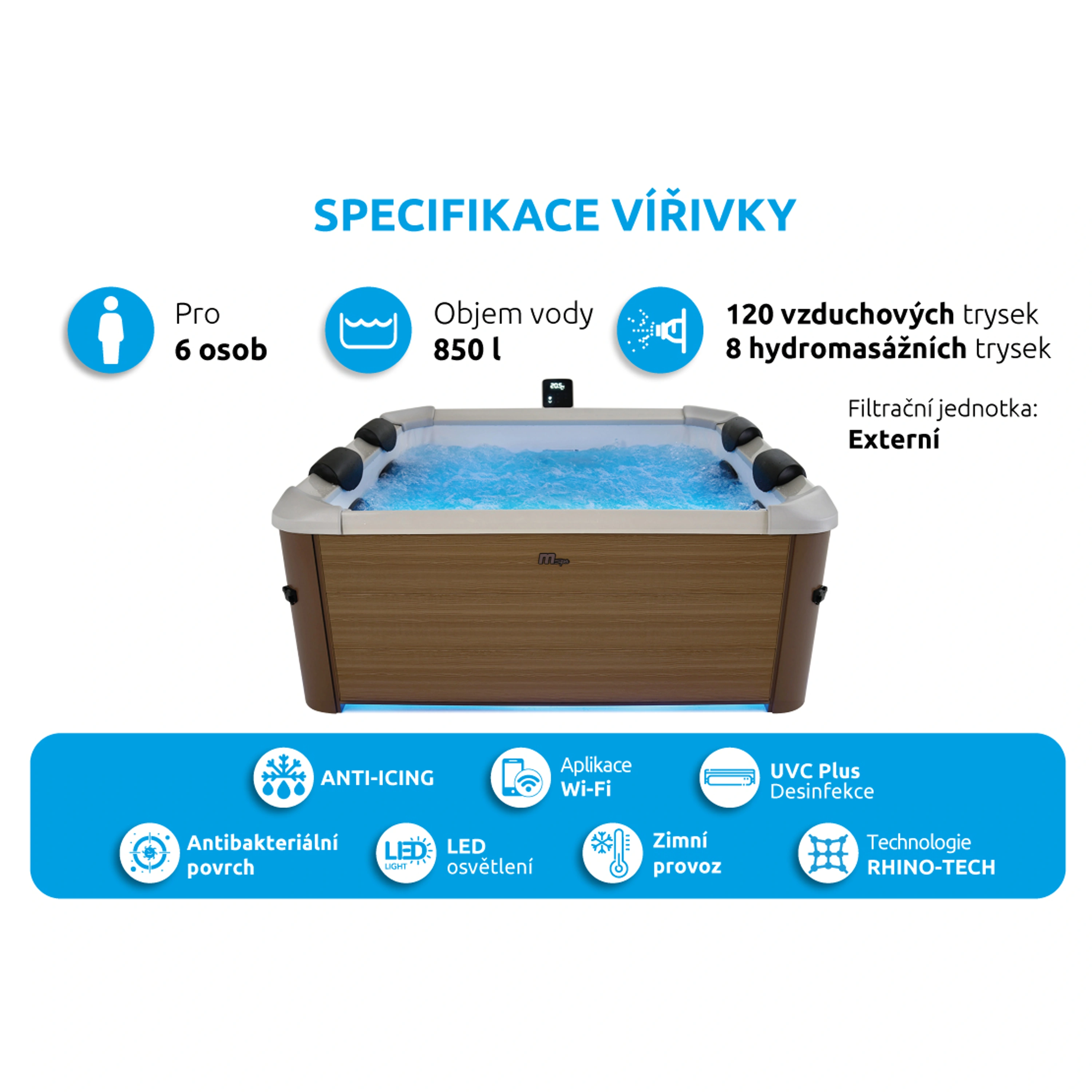 - Trysky: 120 vzduchových + 8 nastavitelných hydromasážních trysek
