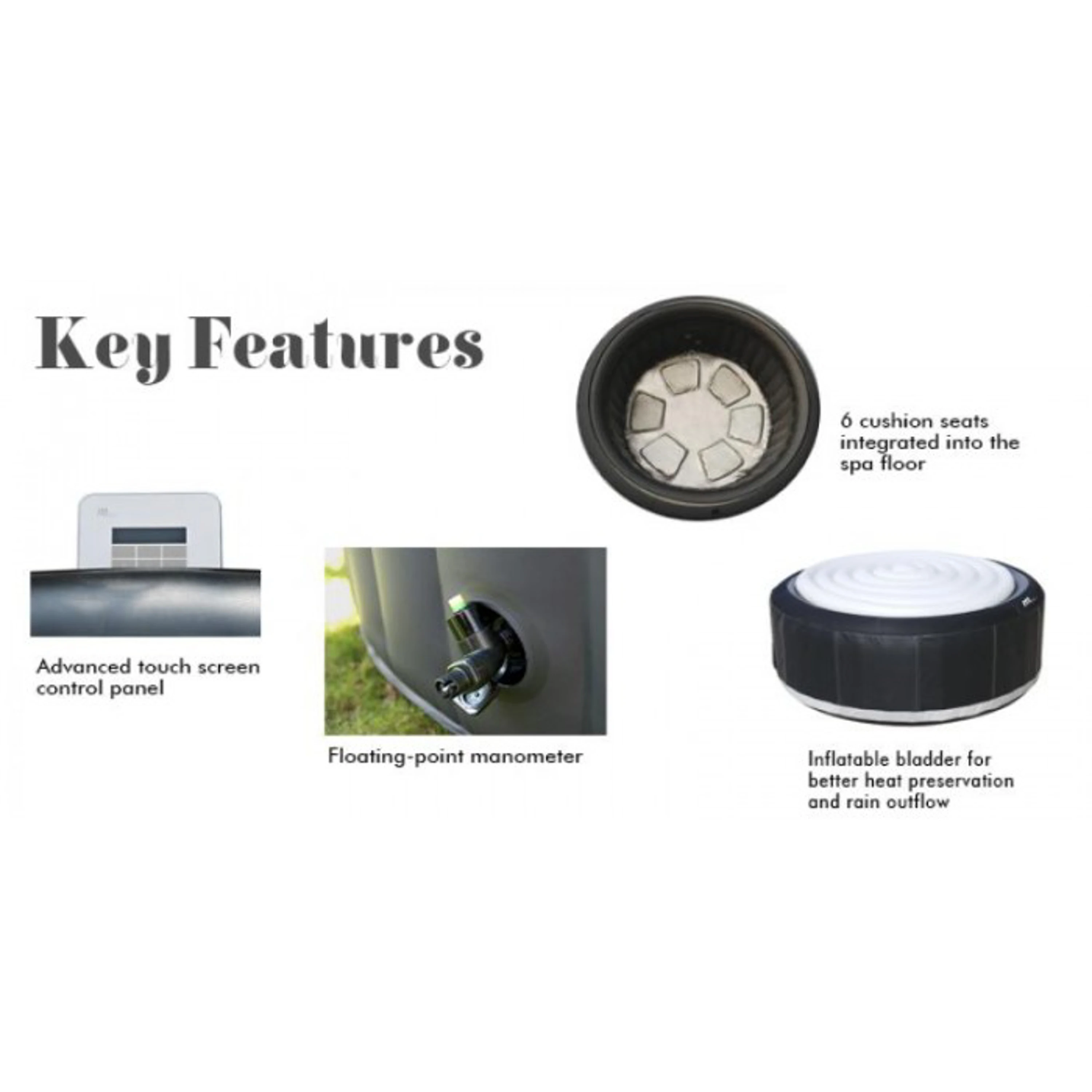 Tato vysoce nadstandardní nafukovací vířivka je vybavena titanovým výměníkem tepla o výkonu 1500W, který vaši vodu vyhřeje až na 42°C. Součástí balení vířivky MSpa M-051 je i izolační termokryt, který zabezpečí minimální tepelné ztráty z vodní hladiny, tlakový manometr, který hlídá tlak vzduchu při procesu nafukování, dále zipem vybavený ochranný kryt, termopodložka, bezpečnostní zámek na kód i dvě kartušové filtrace pro průzračnou vodu vaší vířivé vany.