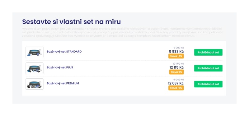 • Právě tady čeká Bazénový rádce s připravenými sety, které jsou chytře rozdělené do tří úrovní: Standard, Plus a Premium. Platí zde jednoduché a výhodné pravidlo: čím vybavenější set si poskládáte, tím výraznější slevu získáte. Nejvyšší úroveň tak přináší nejen maximální komfort pro koupání, ale zároveň zaručuje tu největší možnou úsporu.
