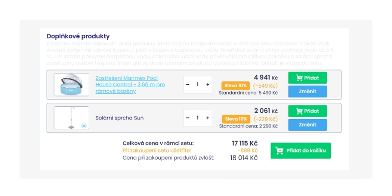 • Přidání do setu: U každého produktu je rovnou vidět běžná cena a vedle ní žlutě zvýrazněná sleva. Pro zařazení konkrétního kusu do výbavy stačí kliknout na modré tlačítko „Přidat“.
