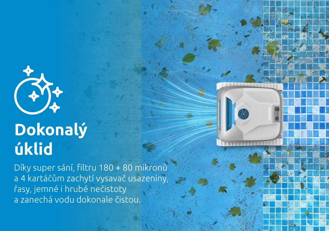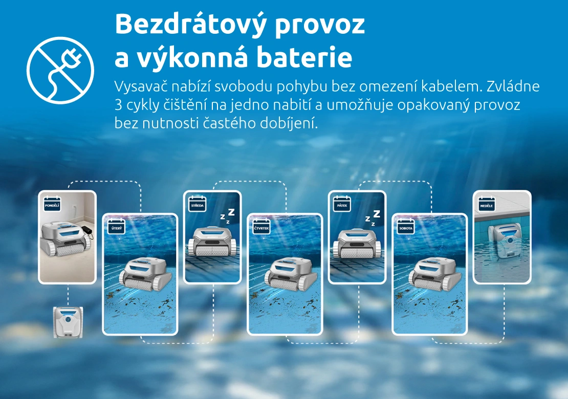 Díky chytrým senzorům a systematickému mapování prostoru dokáže vysavač optimalizovat svou trasu a zajistit maximální pokrytí celé plochy bazénu včetně rohů a schodů. Výkonný sací systém spolu s precizní filtrací zachytí hrubé nečistoty i jemné částice, takže voda zůstane křišťálově čistá. Bezdrátový provoz a ovládání přes mobilní aplikaci navíc přinášejí maximální komfort a flexibilitu při používání.