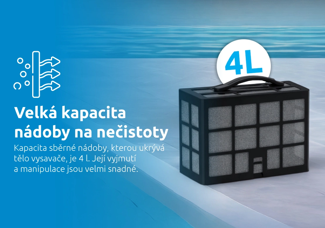 Díky výkonu 240 W a třem motorům nabízí vysavač silné a stabilní sání. Kombinace filtrů 180 a 80 mikronů zachytí větší nečistoty i jemné částice. Čtyři aktivní kartáče účinně uvolňují usazeniny ze dna i stěn. Velká sběrná nádoba o objemu 4 litry umožňuje delší provoz bez nutnosti častého vyprazdňování. Přístroj je vhodný i do slané vody, což z něj činí univerzální řešení pro různé typy bazénů. Výsledkem je křišťálově čistá voda připravená ke koupání.