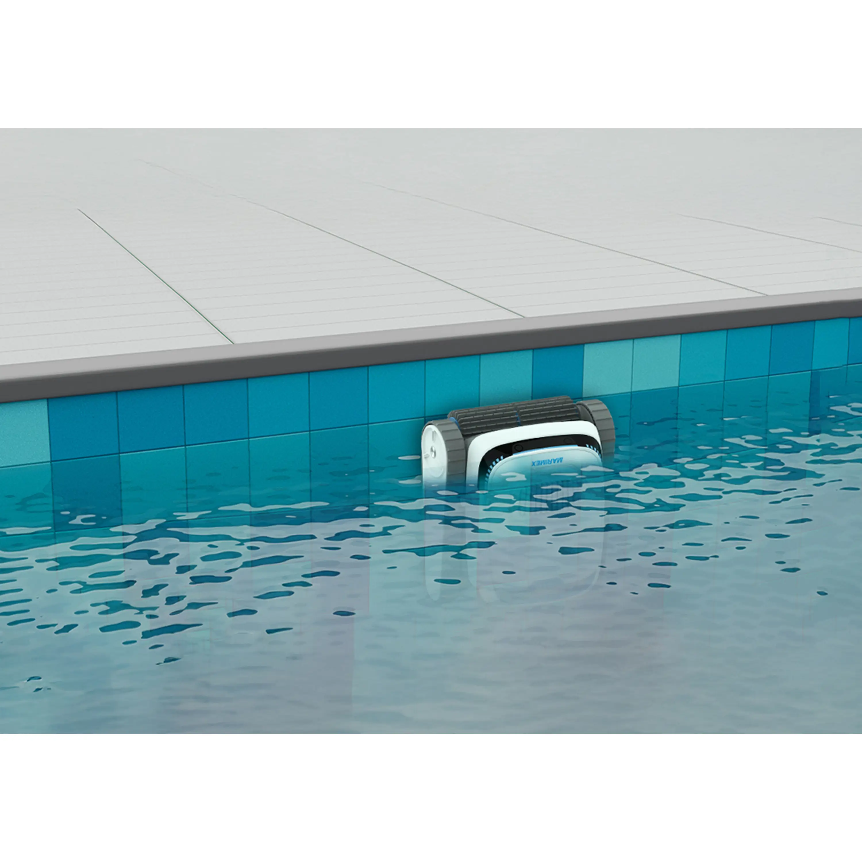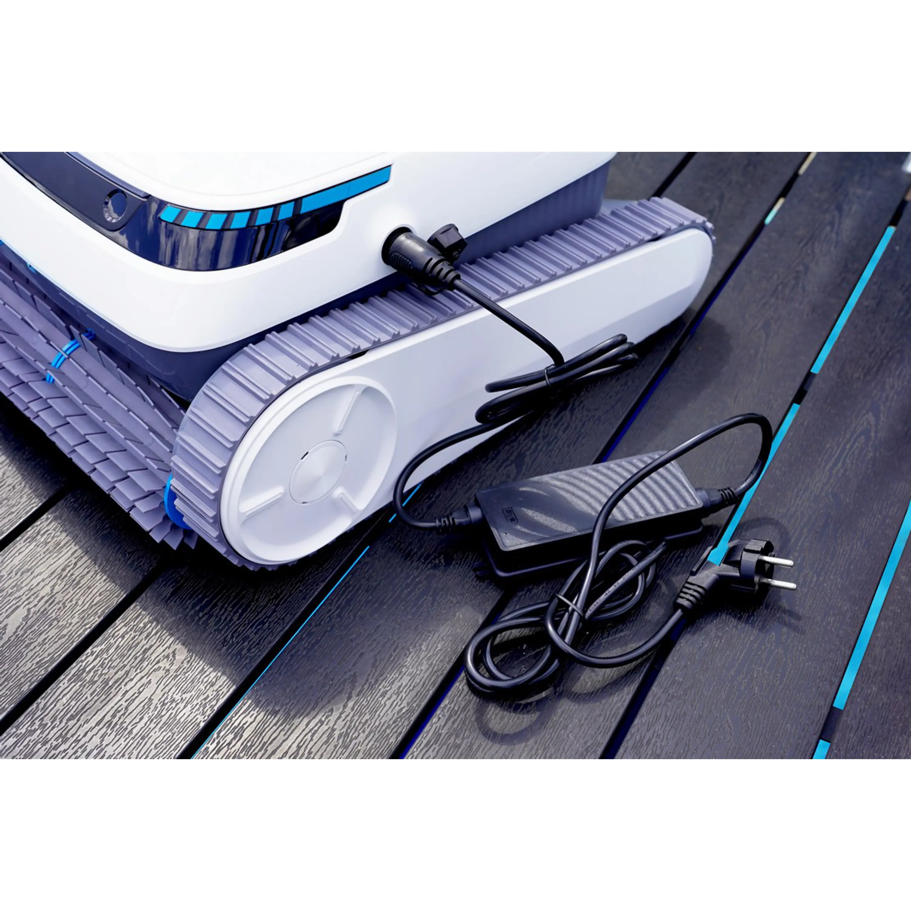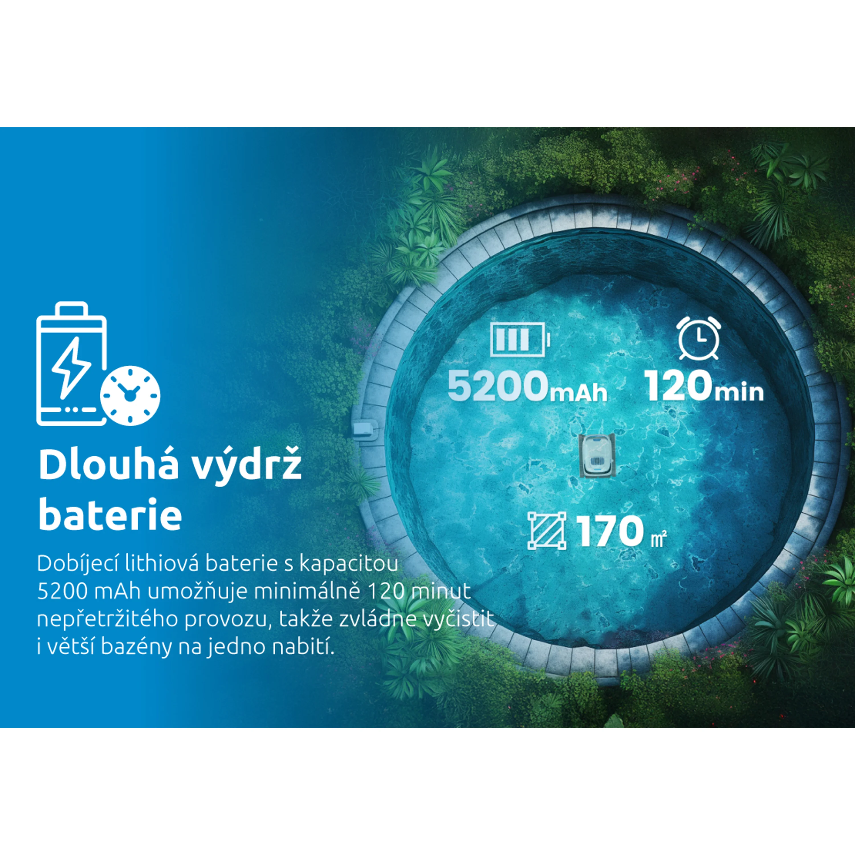 Bezdrátové provedení, kompaktní design a automatické parkování u stěny bazénu po dokončení čištění, zvyšují komfort uživatele a usnadňují manipulaci s vysavačem. Krytí IP68 poskytuje vysokou odolnost vůči vodě. Vysavač je vhodný pro bazény do hloubky 2,5 metru a lze jej používat v teplotním rozmezí vody od 5 °C do 35 °C, což jej činí univerzálním pomocníkem pro každý bazén. Je ideálním řešením pro ty, kteří hledají výkonný, spolehlivý a snadno ovladatelný vysavač pro svůj bazén.