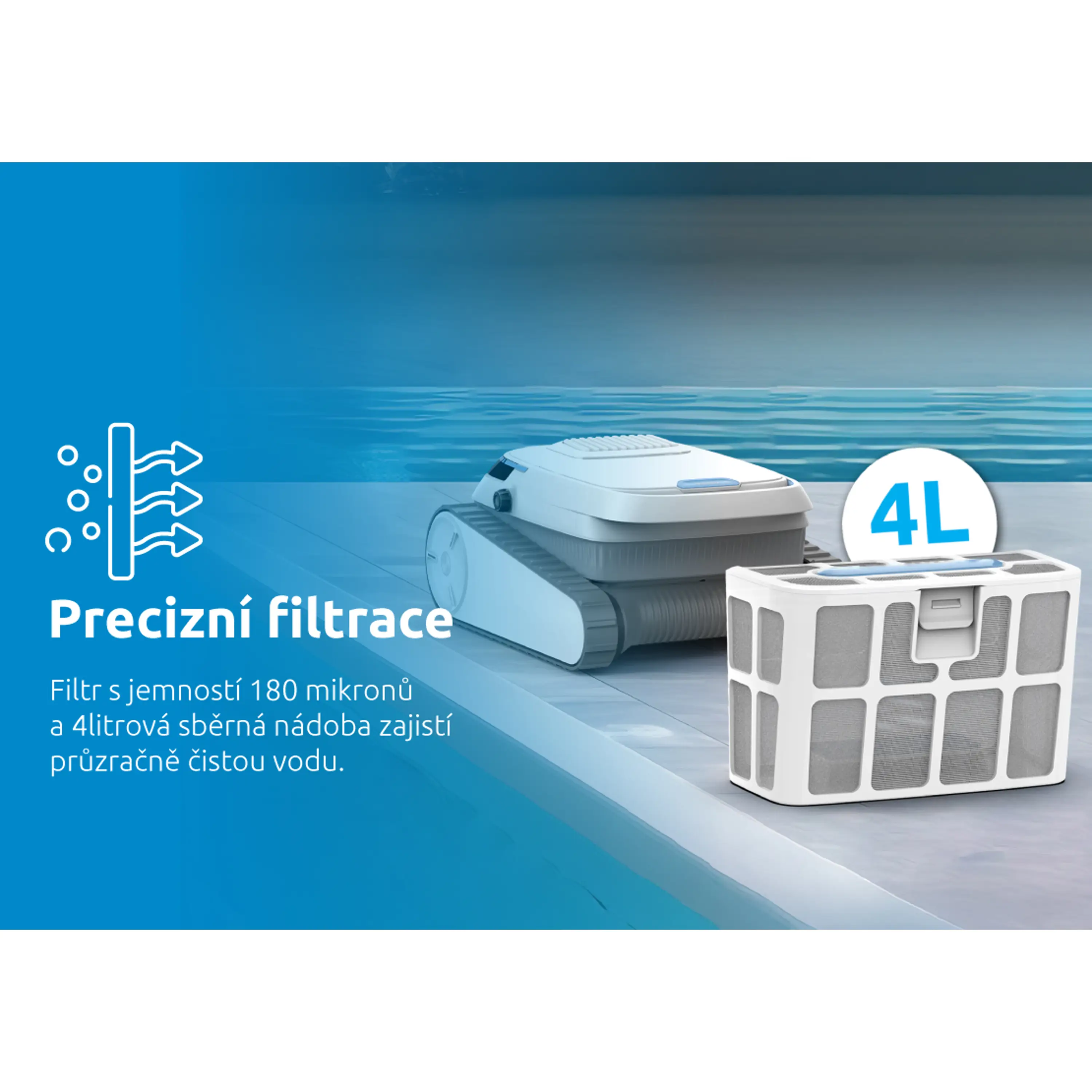 Robotický vysavač je vybaven pokročilým filtračním systémem s jemností 180 mikronů, který účinně zachytí i ty nejjemnější nečistoty. Velká sběrná nádoba s kapacitou 4 litry pojme značné množství nečistot, což minimalizuje potřebu častého vyprazdňování. Díky této kombinaci si můžete být jisti, že váš bazén zůstane průzračně čistý a připravený ke koupání za všech okolností.