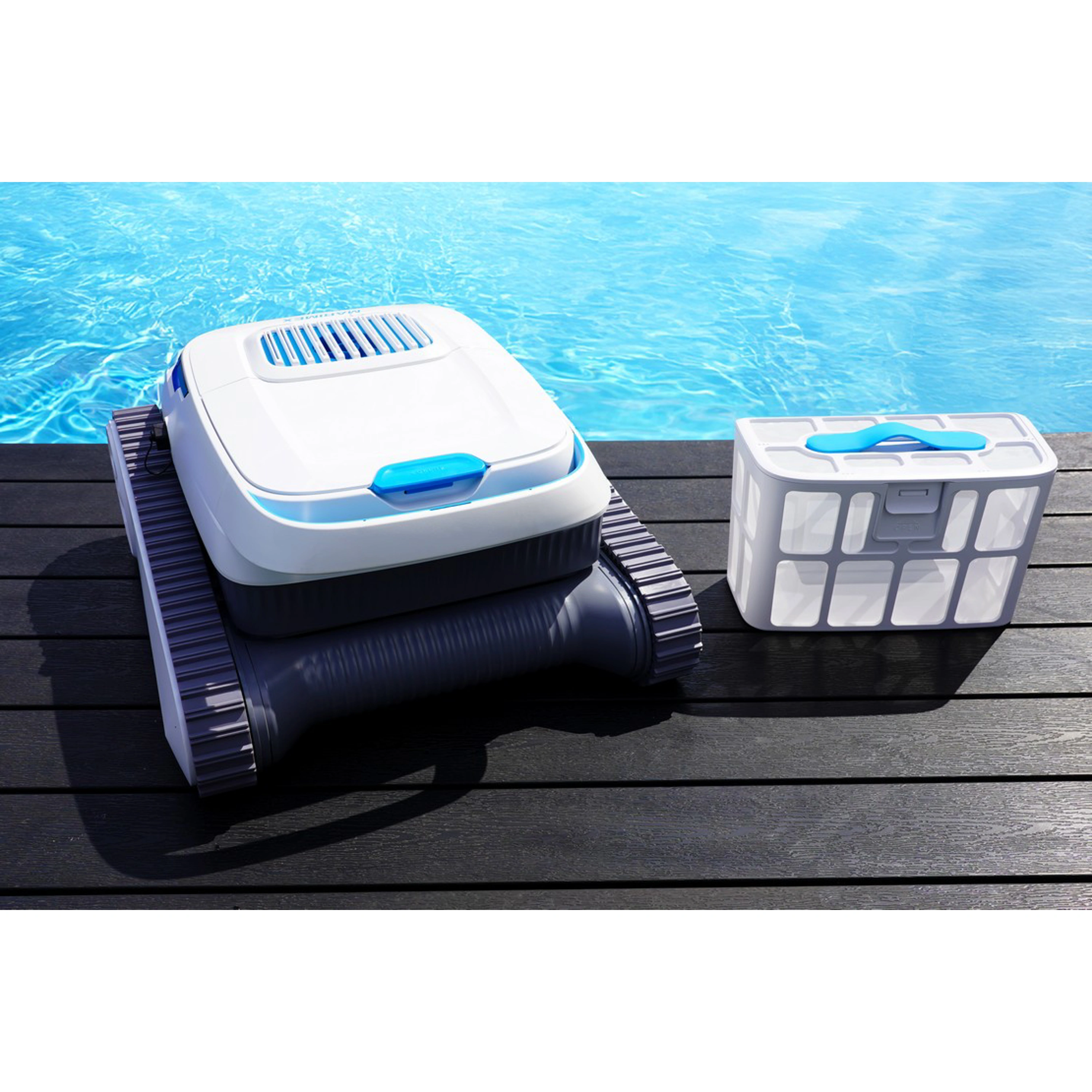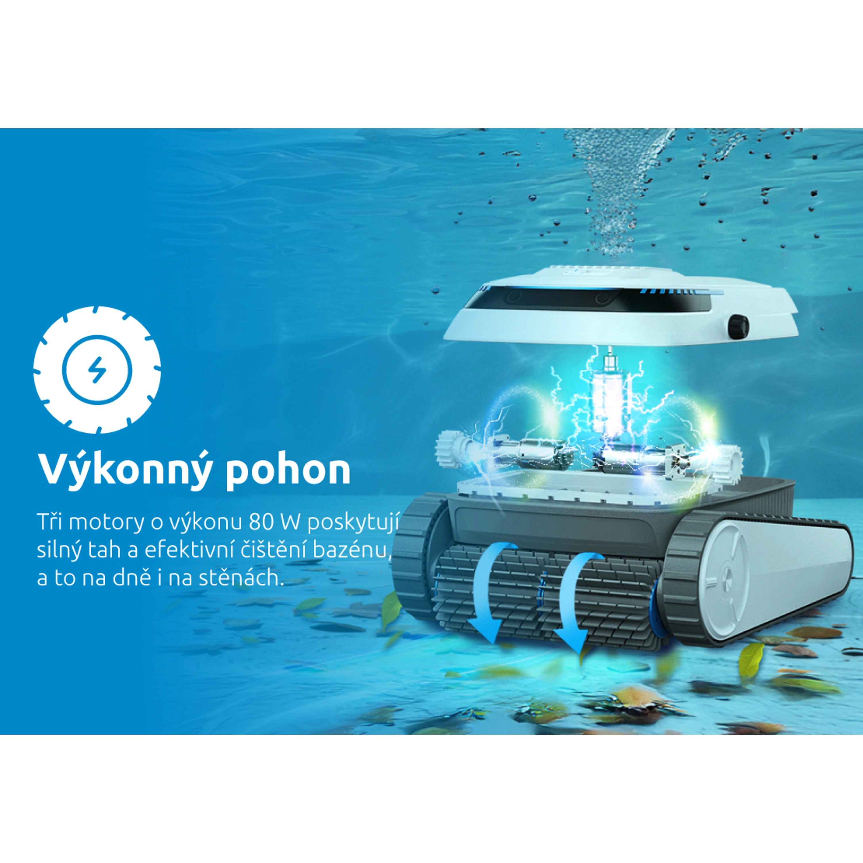 Bezdrátové provedení, kompaktní design a automatické parkování u stěny bazénu po dokončení čištění, zvyšují komfort uživatele a usnadňují manipulaci s vysavačem. Krytí IP68 poskytuje vysokou odolnost vůči vodě. Vysavač je vhodný pro bazény do hloubky 2,5 metru a lze jej používat v teplotním rozmezí vody od 5 °C do 35 °C, což jej činí univerzálním pomocníkem pro každý bazén. Je ideálním řešením pro ty, kteří hledají výkonný, spolehlivý a snadno ovladatelný vysavač pro svůj bazén.