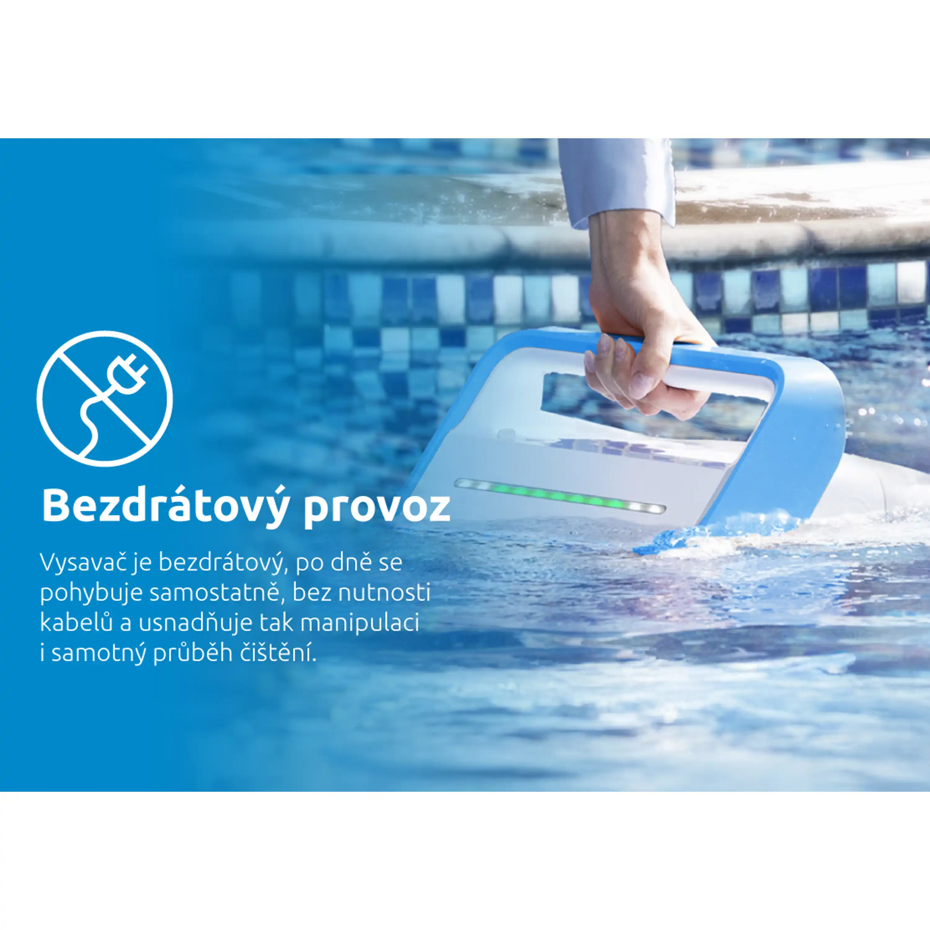 Vysavač je bezdrátový, po dně se pohybuje samostatně, bez nutnosti kabelů a usnadňuje tak samotný průběh čištění. Funkce automatického parkování u stěny zjednodušuje manipulaci a usnadňuje vyjmutí z bazénu po dokončení čištění. Bazénový vysavač je konstruován tak, aby bez problémů fungoval i ve slané vodě. Díky odolným materiálům a speciální úpravě si poradí s údržbou slaných bazénů stejně efektivně jako s klasickými.