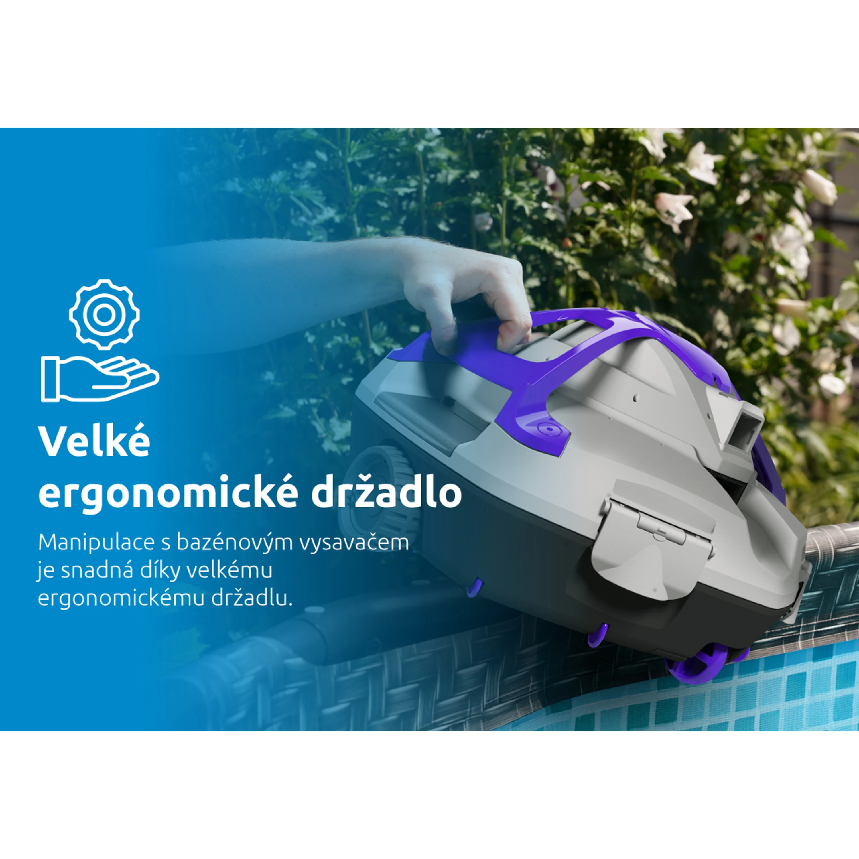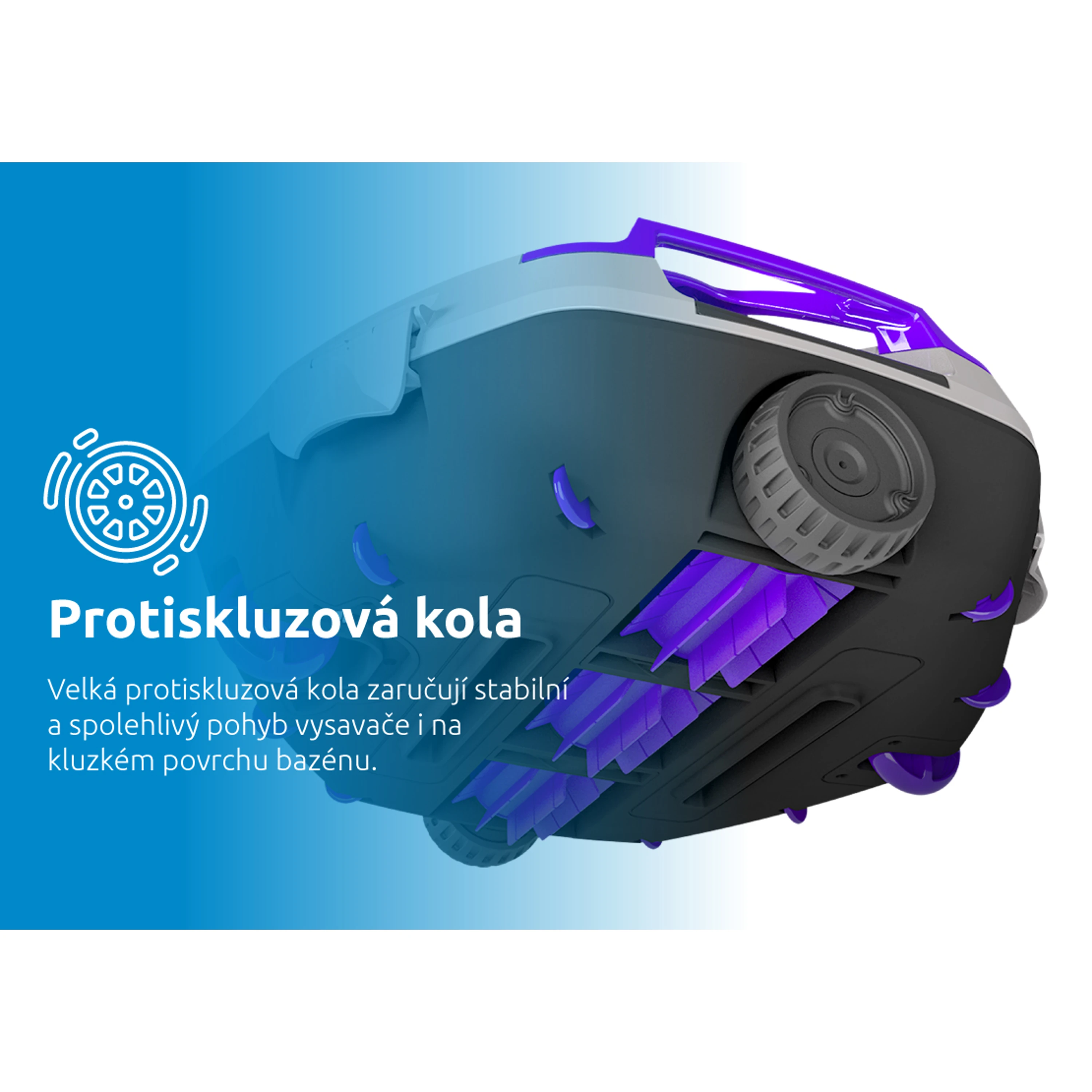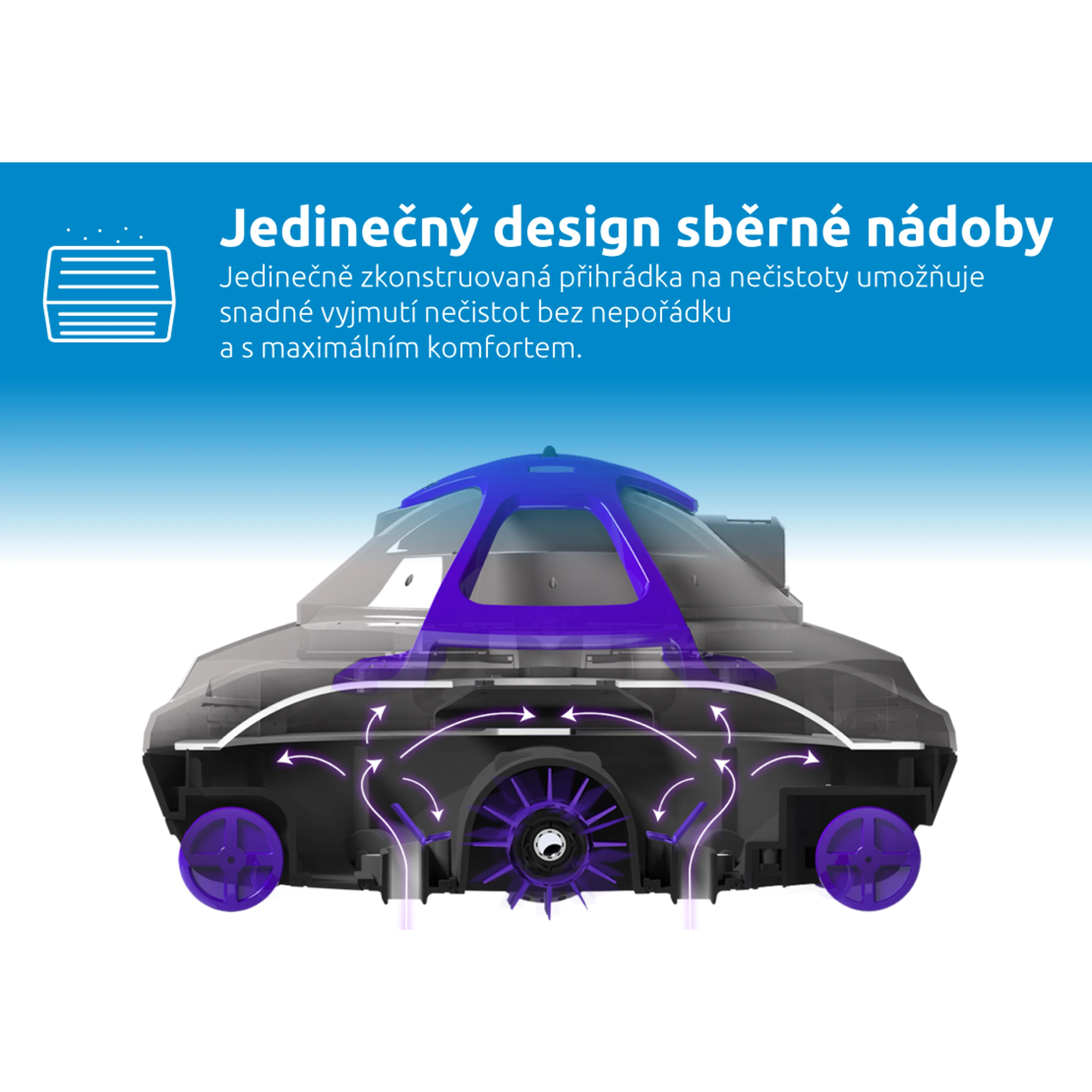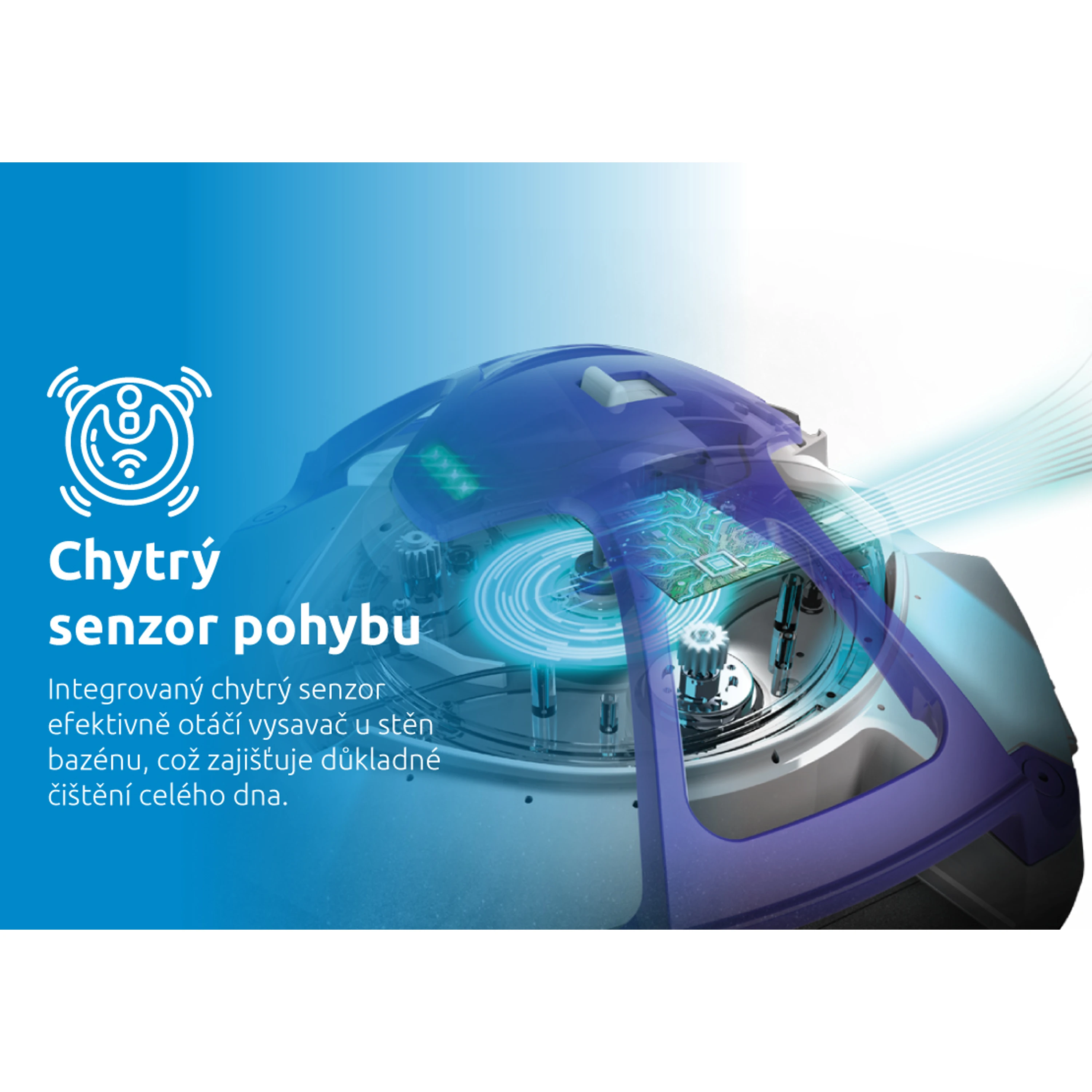 Velká protiskluzová kola zaručují stabilní a spolehlivý pohyb vysavače i na kluzkém povrchu bazénu. Integrovaný chytrý senzor efektivně otáčí vysavač u stěn bazénu a tím zajišťuje důkladné čištění celého dna. Jedinečně konstruovaná přihrádka na nečistoty umožňuje snadné vyjmutí nečistot bez nepořádku a s maximálním komfortem.