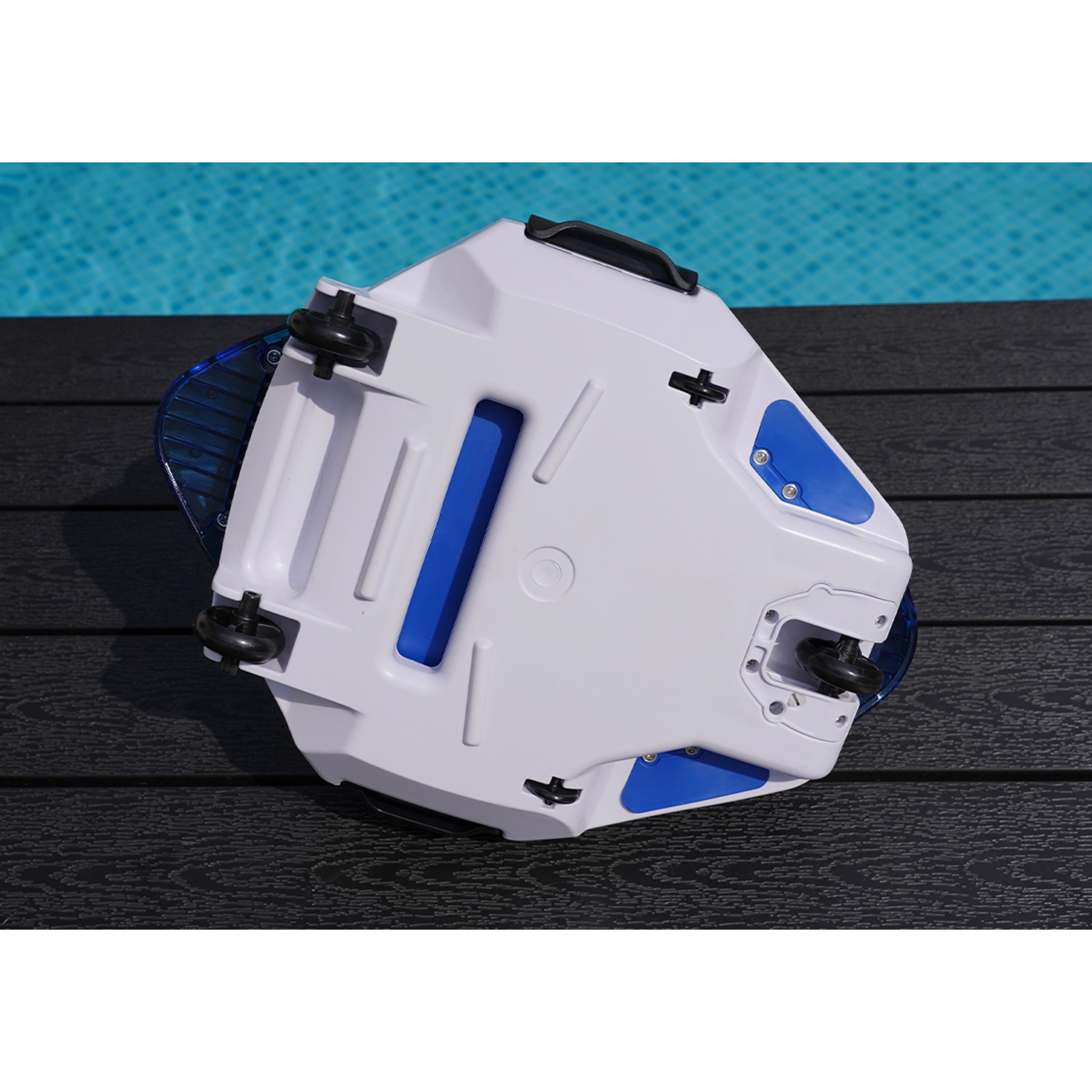 Vysavač je vybaven dobíjecí lithiovou baterií, která umožňuje bezdrátový provoz až na 45 minut. LED indikátor baterie přehledně zobrazuje stav nabití, přičemž plné dobití trvá přibližně 5–6 hodin. Bezdrátový design zvyšuje flexibilitu a usnadňuje použití vysavače v různých typech bazénů.