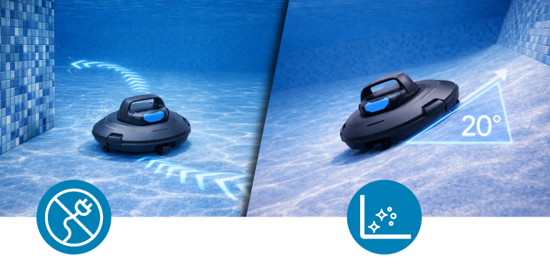Už žádné zamotané hadice nebo kabely. Bezdrátový vysavač Marimex SupraVac Trinity se pohybuje samostatně, přizpůsobuje směr pomocí technologie detekce překážek a bez problému zvládne nerovné dno i šikmé plochy až do 20°.