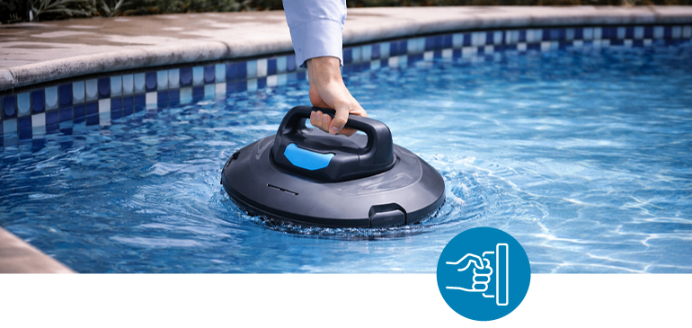 Díky ergonomickému držadlu se vysavač snadno přenáší i vyjímá z vody. Praktické bezpečnostní západky umožňují rychlé otevření a vyčištění filtru bez nutnosti složitého rozebírání.