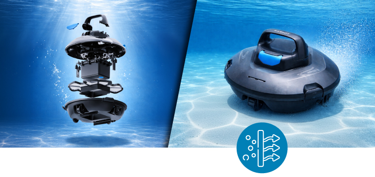 Dva silné motory a dvojice senzorů v pohonném systému zajišťují plynulý pohyb, efektivní využití energie a důkladné odstranění nečistot z každého zákoutí bazénu. Filtr s jemností 180 μm zachytí i ty nejmenší částice.