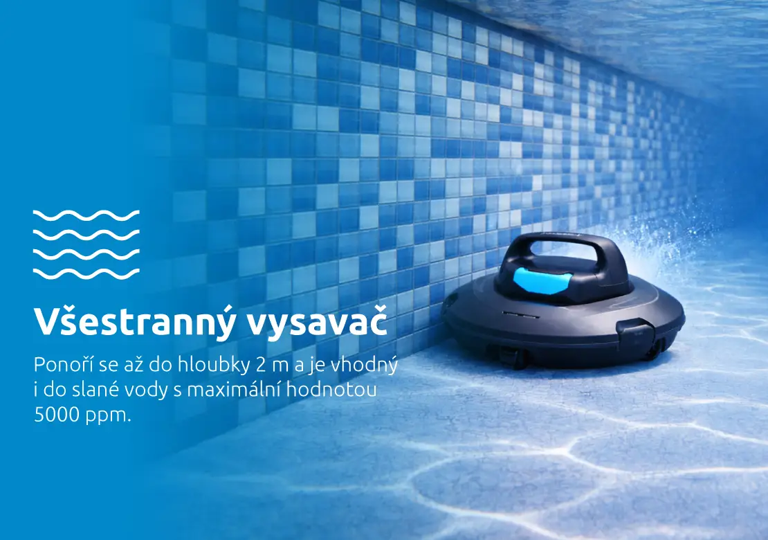 Model SupraVac Trinity je určen pro všechny typy bazénů — včetně slané vody do 5000 ppm. S kapacitou zásobníku 2,4 litru a průtokem 75,3 l/min si poradí i s většími nečistotami. Bez problémů se ponoří až do hloubky 2 metrů.