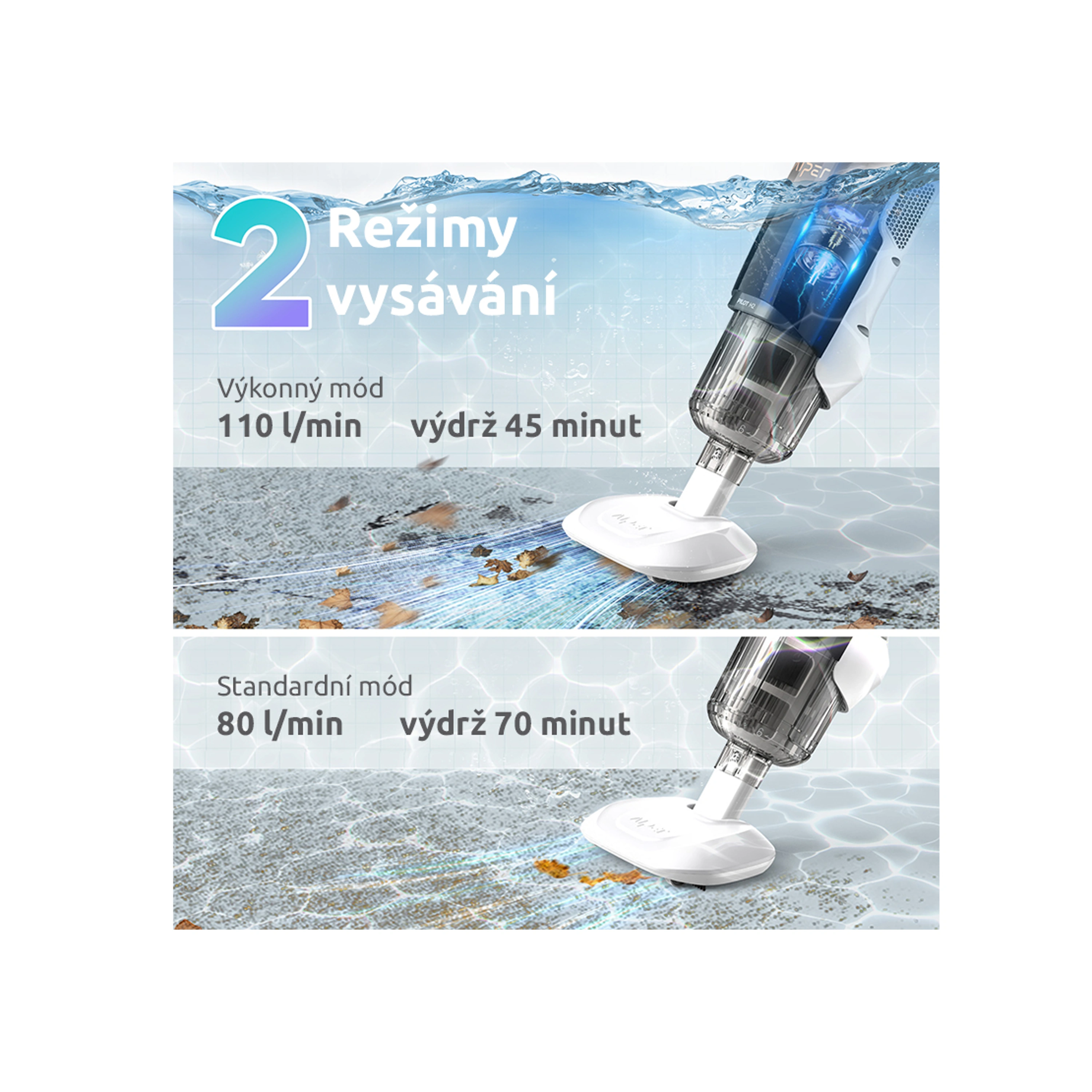 - Vysavač lze držet za ergonomickou rukojeť nebo ho lze připojit ke standardní teleskopické tyči
