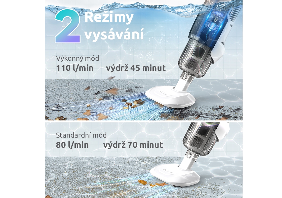 - Vysavač lze držet za ergonomickou rukojeť nebo ho lze připojit ke standardní teleskopické tyči