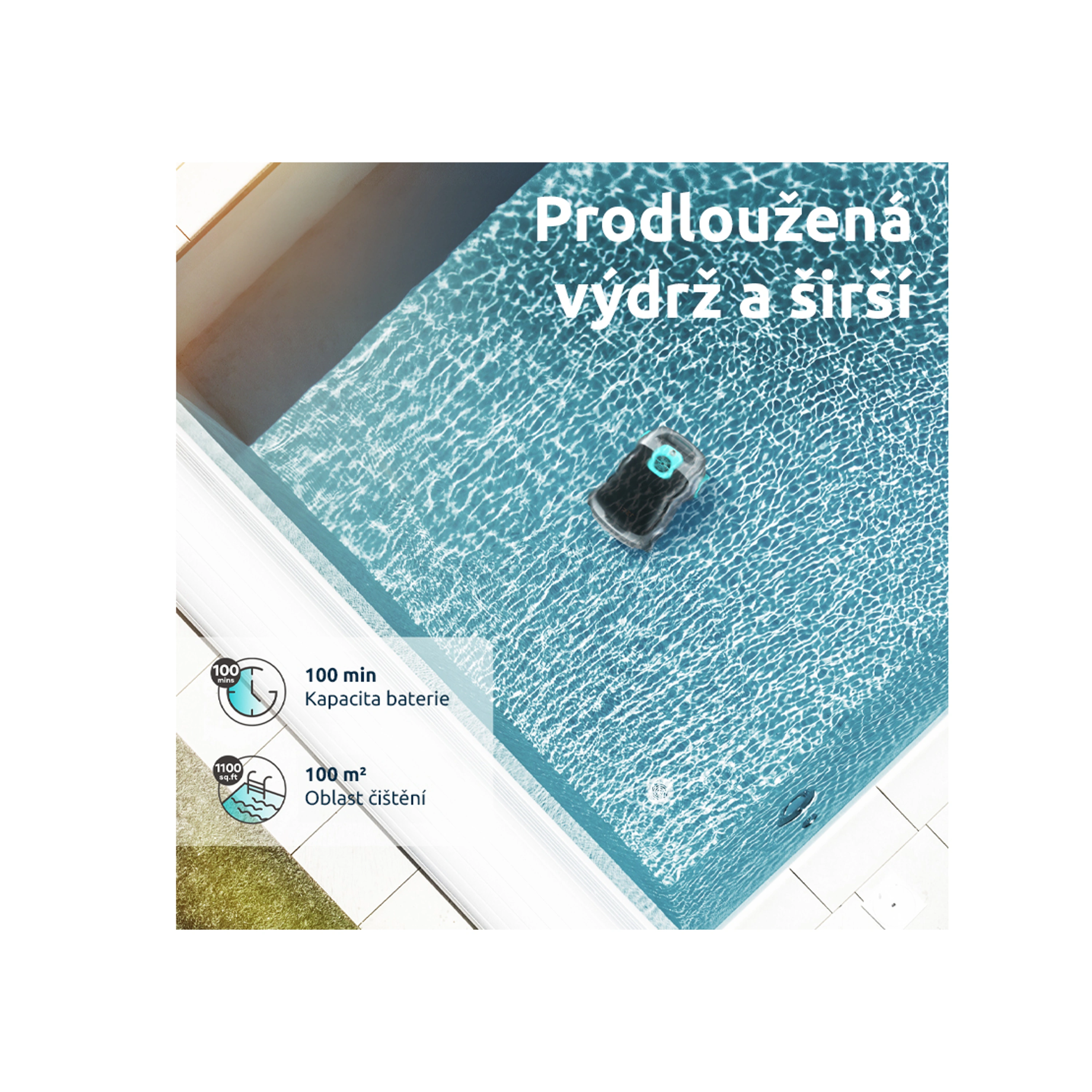 - Pokrytí 100 m²: Scuba E1 zvládne uklidit plochu až 100 m², takže si s ním poradí i větší bazény.