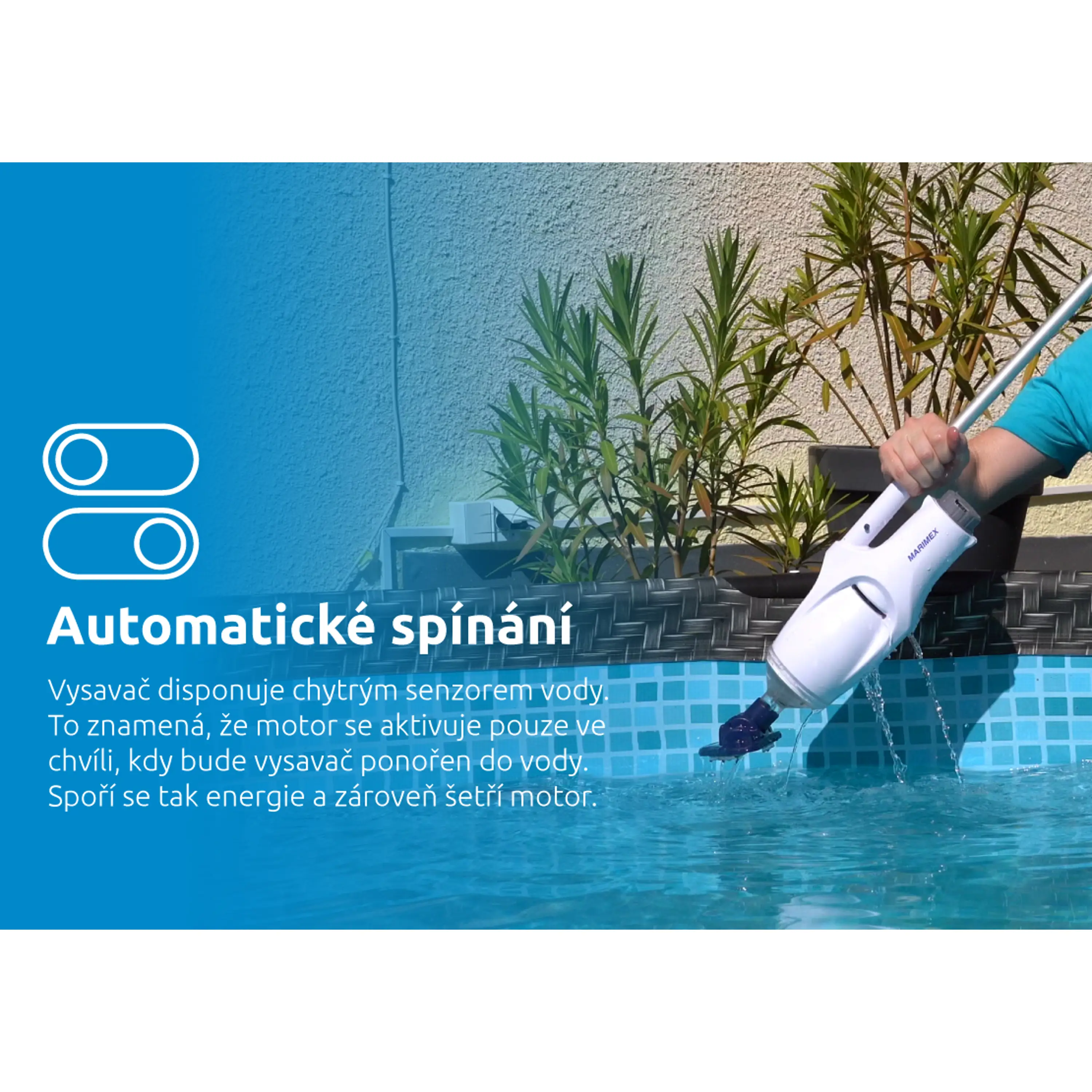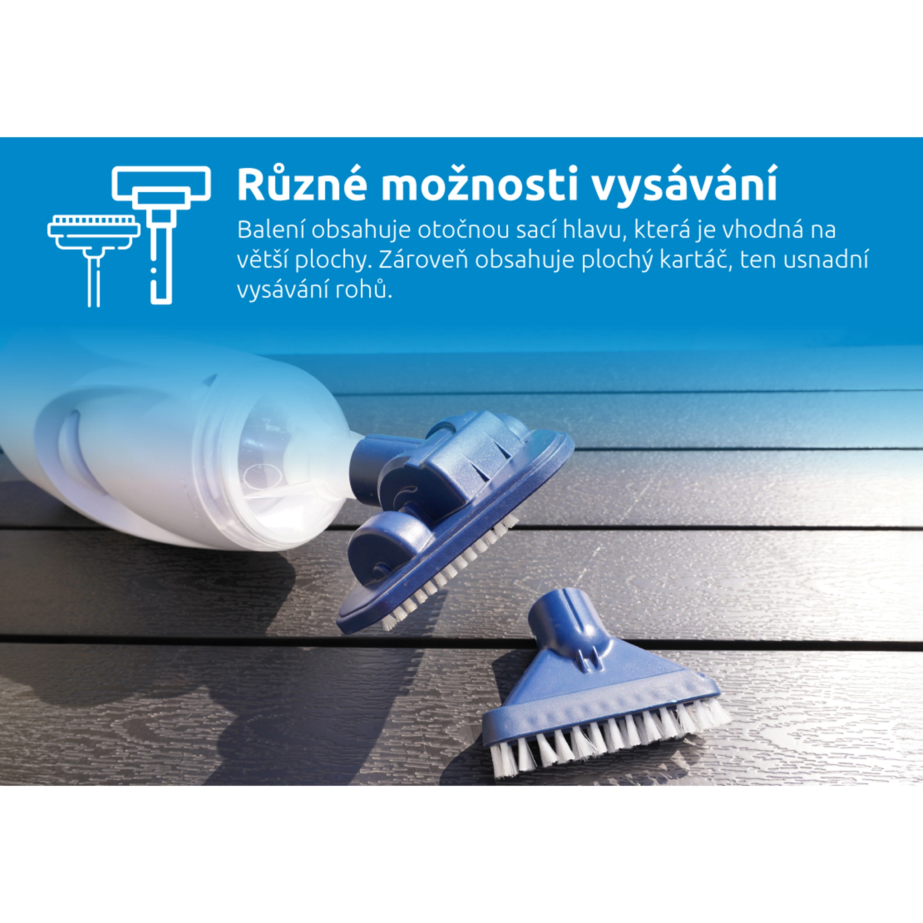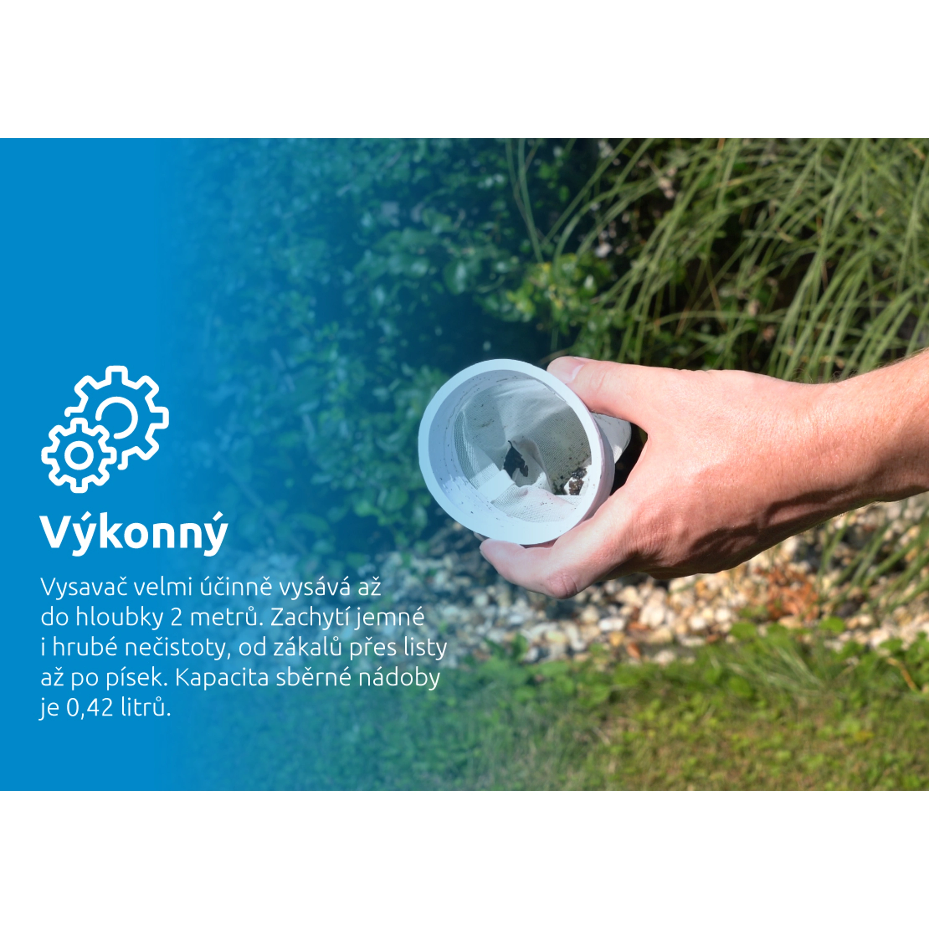 Vysavač velmi účinně vysává až do hloubky 2 metrů. Zachytí jemné i hrubé nečistoty, od zákalů přes listy až po písek. Nečistoty se zachytávají ve filtru, ze kterého se po vysávání snadno vysypou ven. Kapacita sběrné nádoby je 0,42 litrů. Balení vysavače obsahuje otočnou sací hlavu, která je vhodná na větší plochy. Zároveň obsahuje plochý kartáč, ten usnadní vysávání rohů.