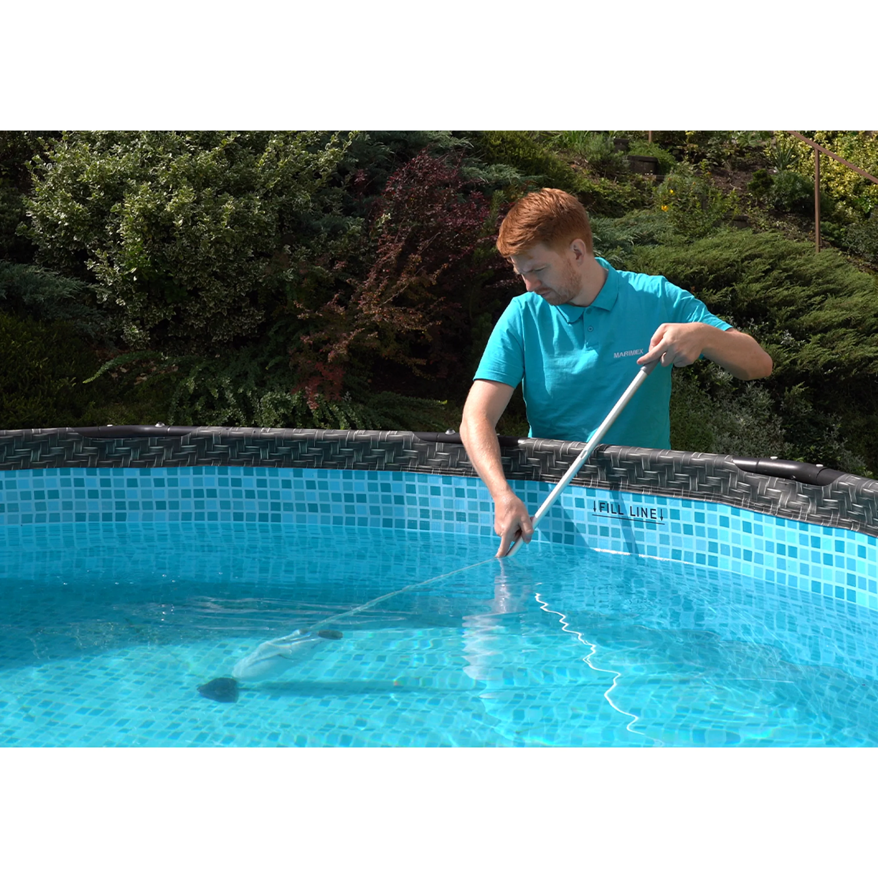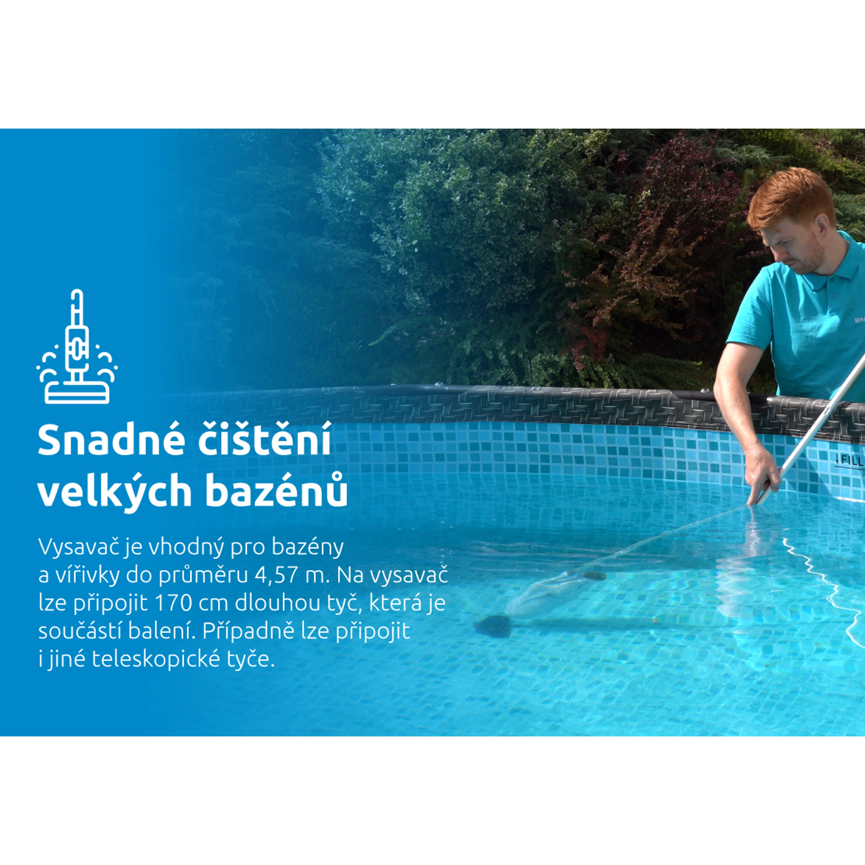 je vhodný pro bazény do průměru 4,57 m. Je možné ho použít i pro vířivky. Na vysavač lze připojit 170 cm dlouhou tyč, která je součástí balení. Případně je možné připojit i jiné teleskopické tyče. Vysavač jednoduše vyčistí dno, či stěny. Díky tomuto vysavači si budete po celou koupací sezónu užívat křišťálově čisté vody se vším všudy.